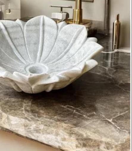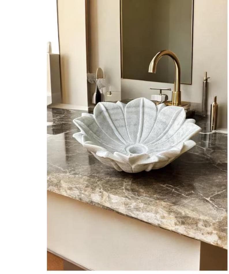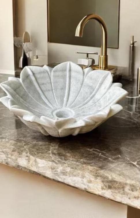 Each petal is meticulously sculpted from a single block of premium white marble, ensuring durability, strength, and a flawless organic flow. The soft curves and smooth polished finish enhance the beauty of the natural stone, showcasing delicate grey veining unique to every piece. Its sculptural design serves as both a functional wash basin and a statement piece of decor, ideal for luxury homes, boutique hotels, or spa-inspired interiors.