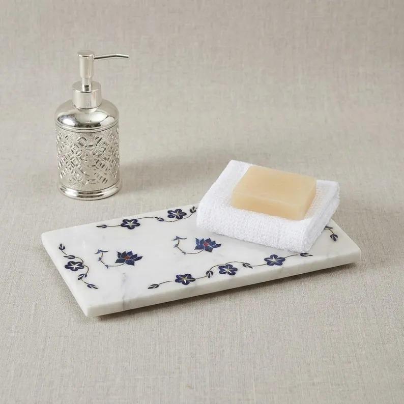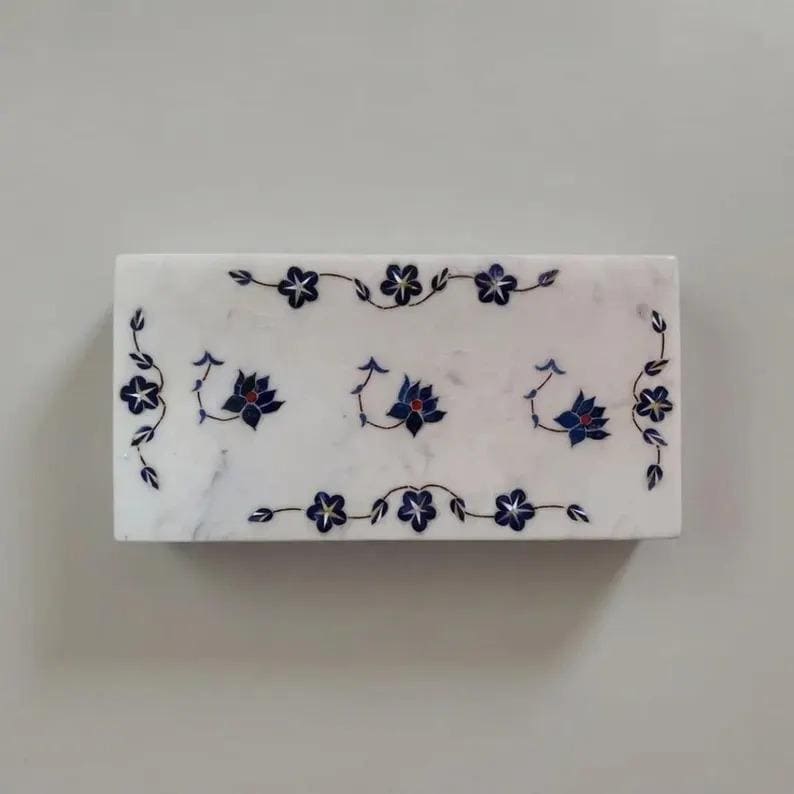 Made from premium natural white marble, the tray is carefully decorated with intricate blue floral inlay patterns. Skilled artisans hand-cut and embed colored stones into the marble surface to create delicate flower and vine motifs, inspired by classic marble inlay techniques. The result is a stunning piece of functional art where every tray showcases unique natural marble veining.