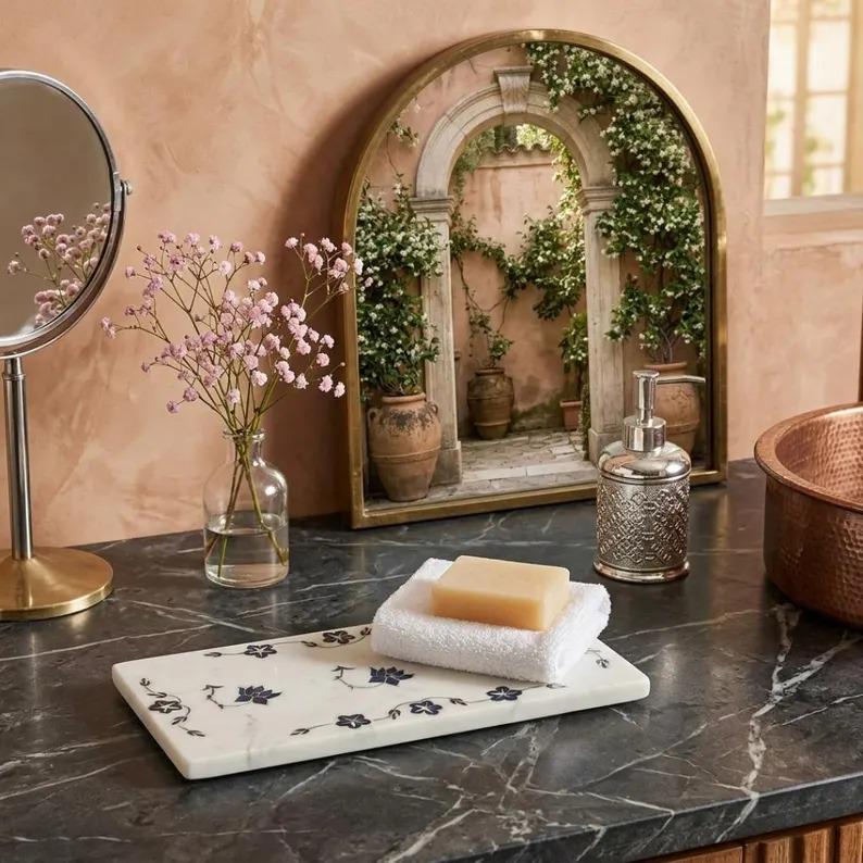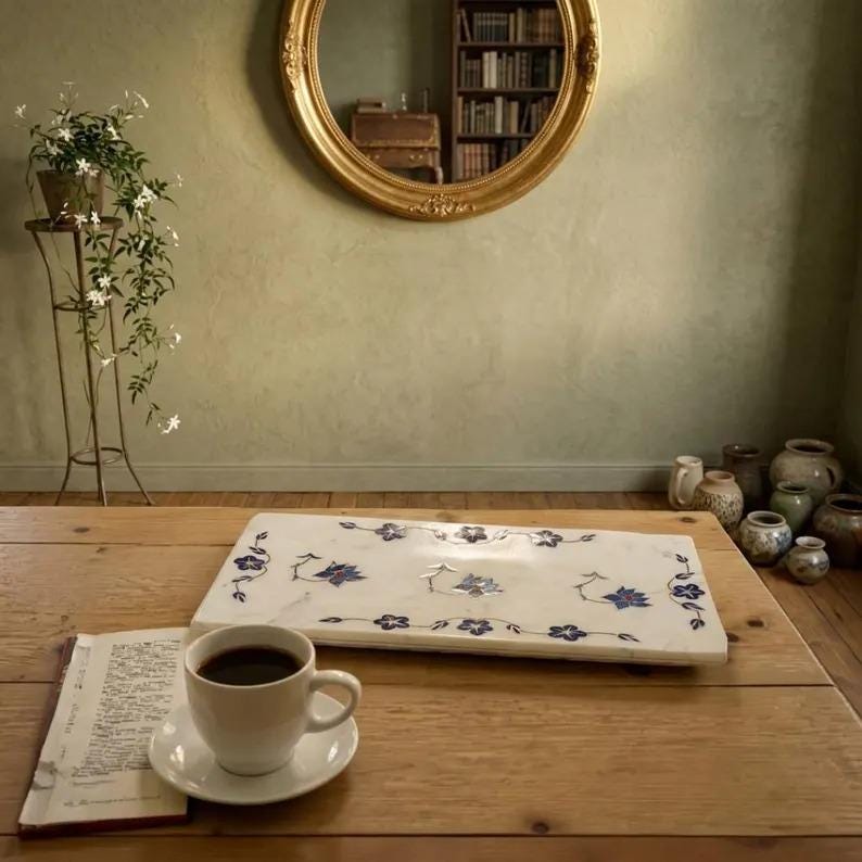 This marble tray brings together timeless design, natural stone beauty, and detailed inlay craftsmanship.