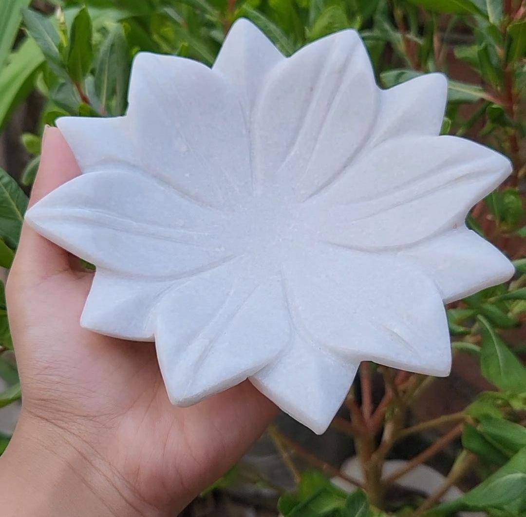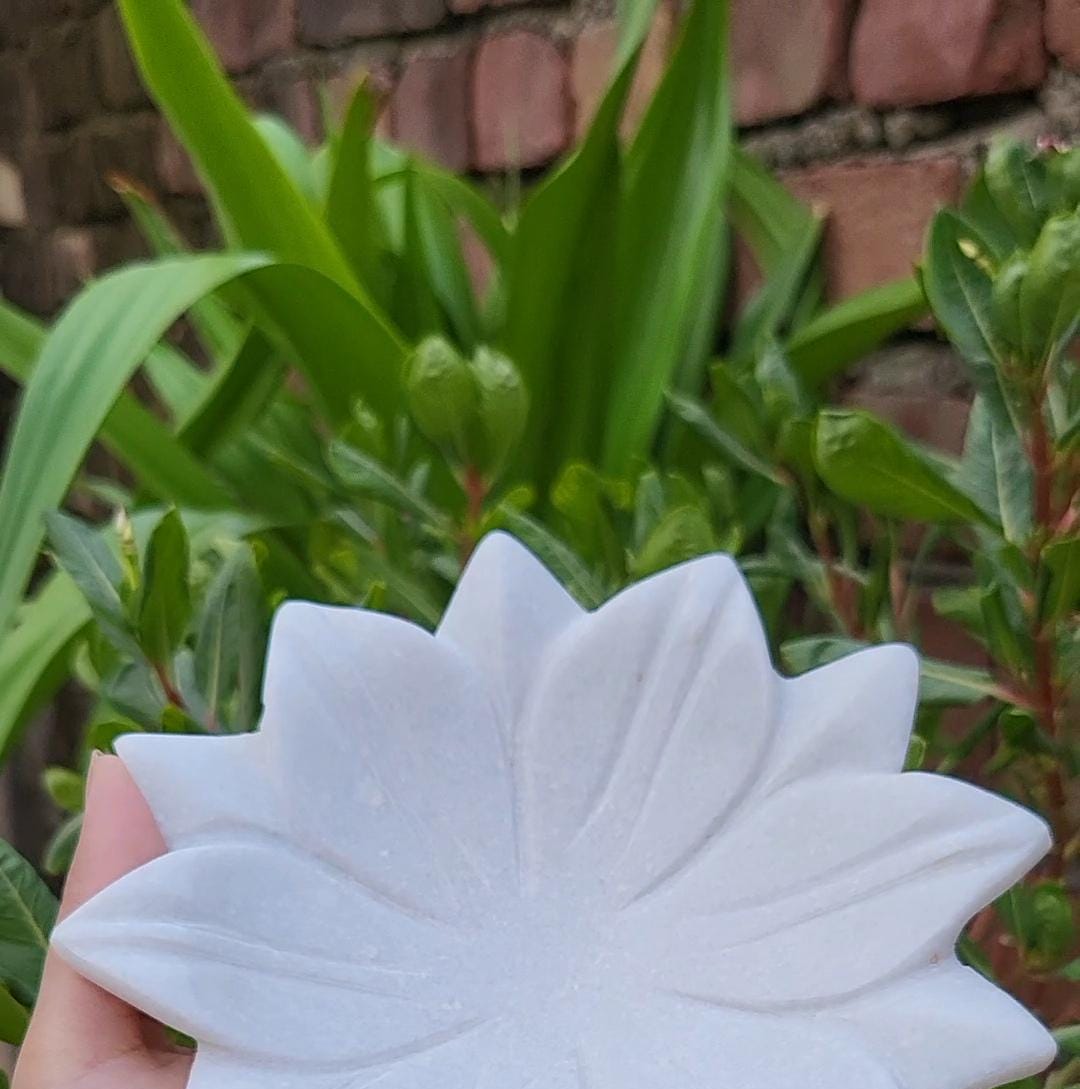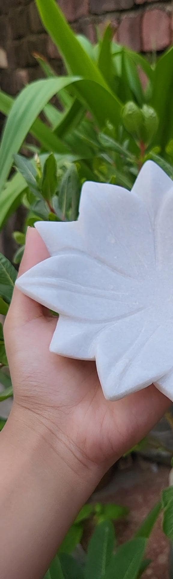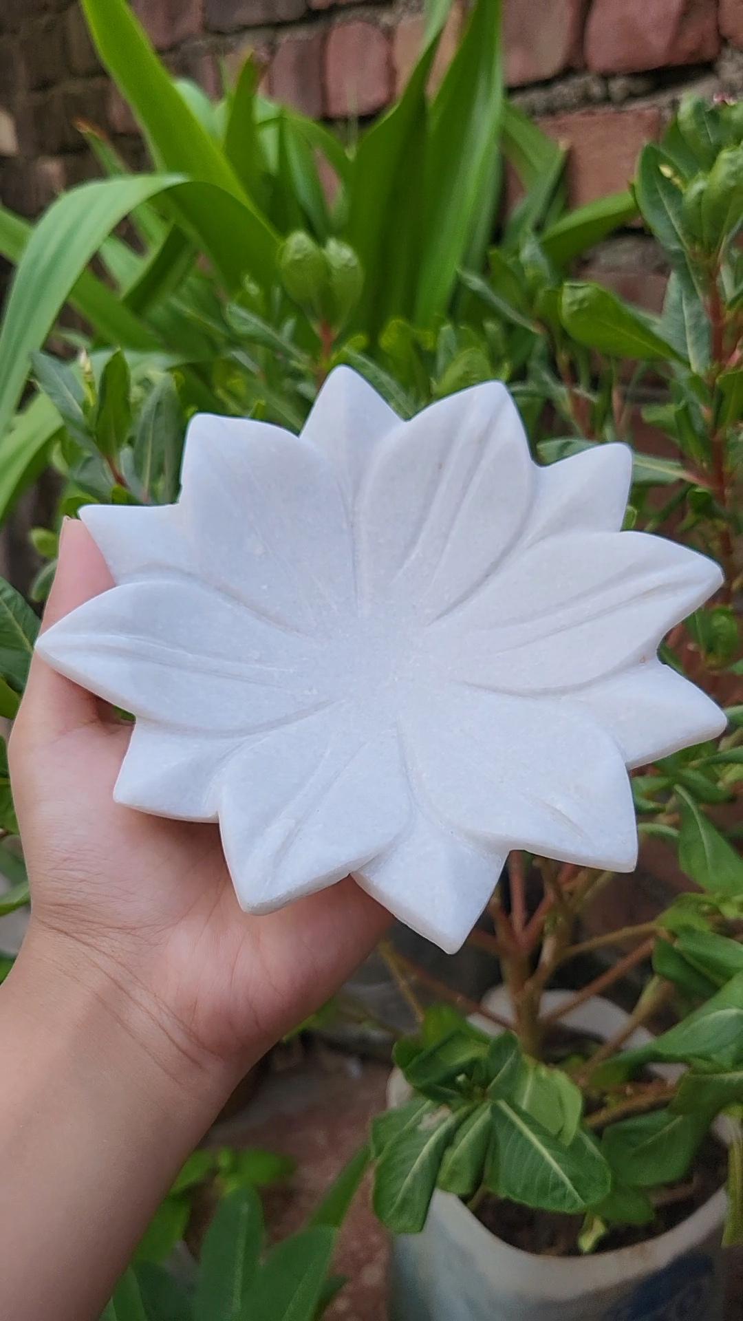 This beautifully handcrafted white marble tray, shaped like a lotus flower, is a perfect blend of elegance and functionality. Ideal for enhancing the aesthetic appeal of any space, it can be used as a decorative centerpiece, jewelry holder, or serving dish for small items. The intricate design and smooth finish of the marble make it a unique piece of art, suitable for both modern and traditional home decor. Its natural white hue brings a touch of serenity and grace to any setting, making it a great gift or a timeless addition to your collection.