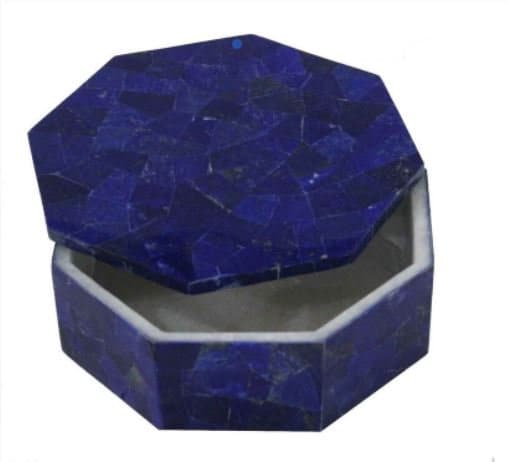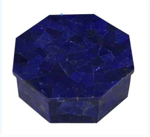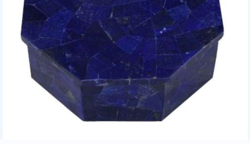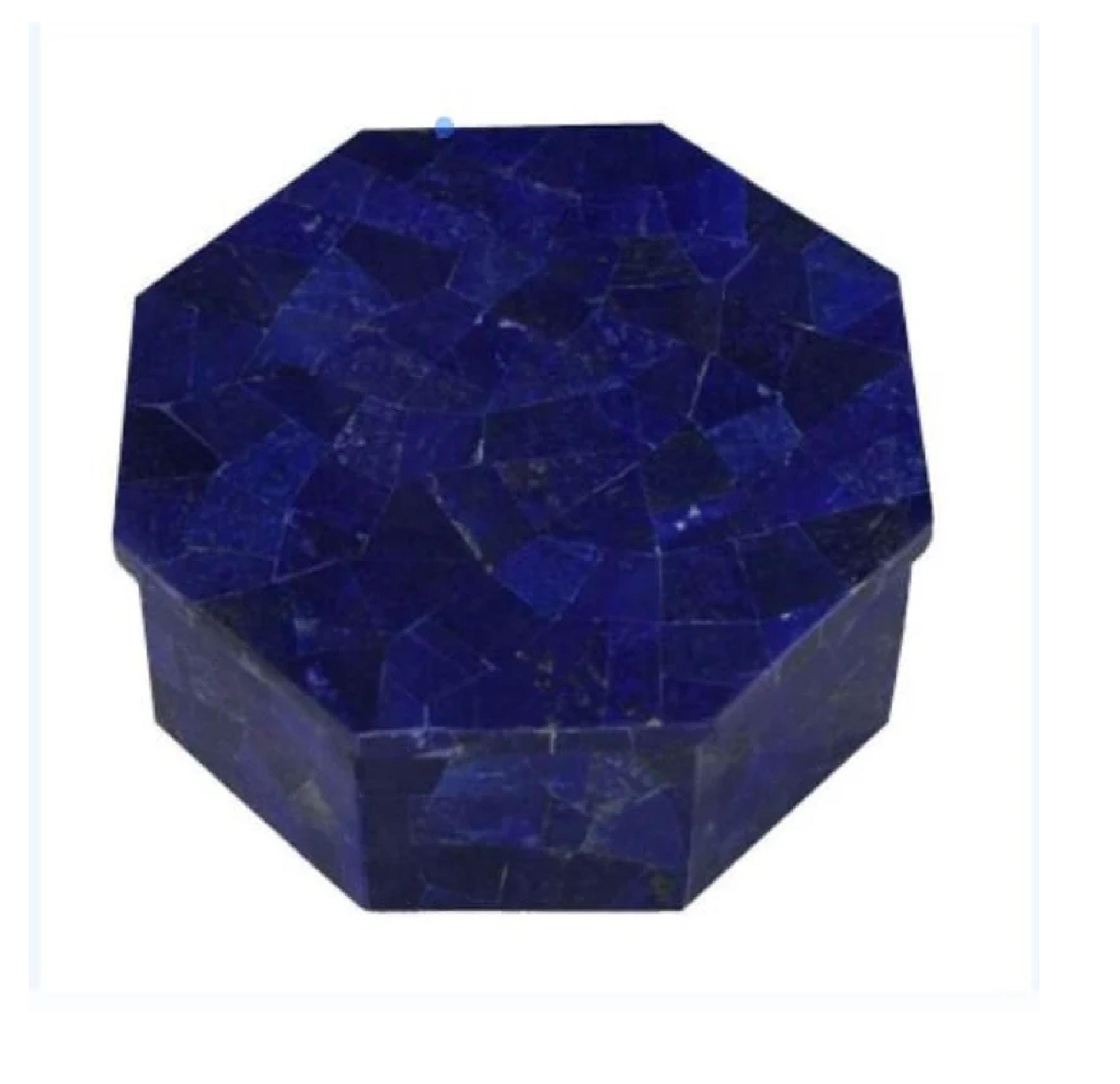 This stunning Lapis Lazuli trinket box features a rich, deep-blue gemstone mosaic that creates a luxurious and timeless look. Crafted in a distinctive octagonal shape, the box showcases polished natural lapis lazuli pieces arranged in a geometric pattern on the lid and sides, highlighting the stone’s intense royal blue color with subtle natural variations.