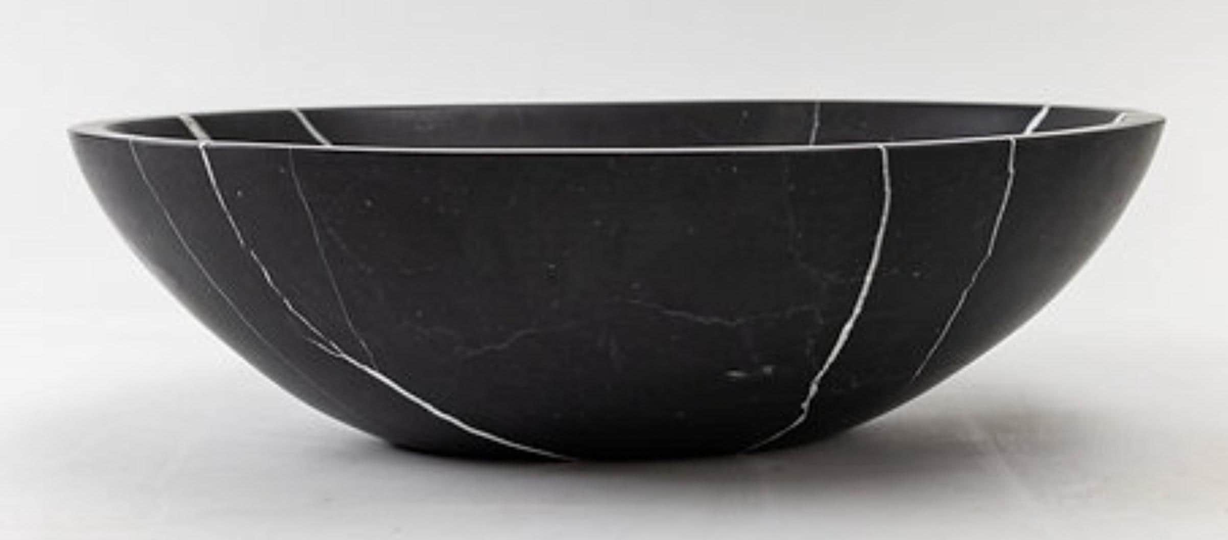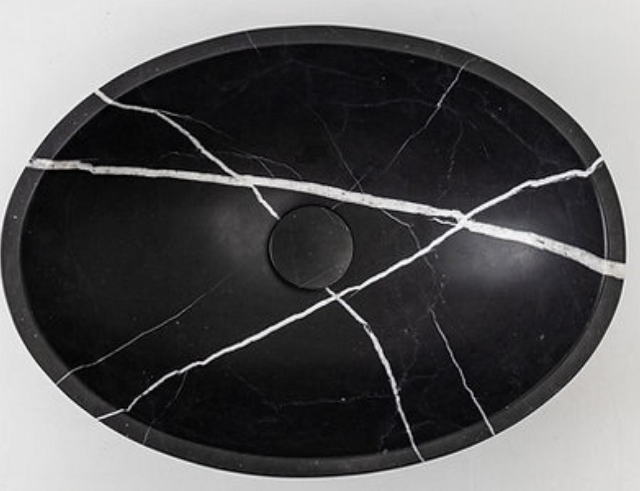 Add timeless elegance to your bathroom with this handcrafted black marble vessel sink, beautifully carved from a single block of natural stone. The smooth, round bowl shape highlights the striking white natural veining across the deep black marble, creating a bold and luxurious centerpiece for any bathroom vanity.