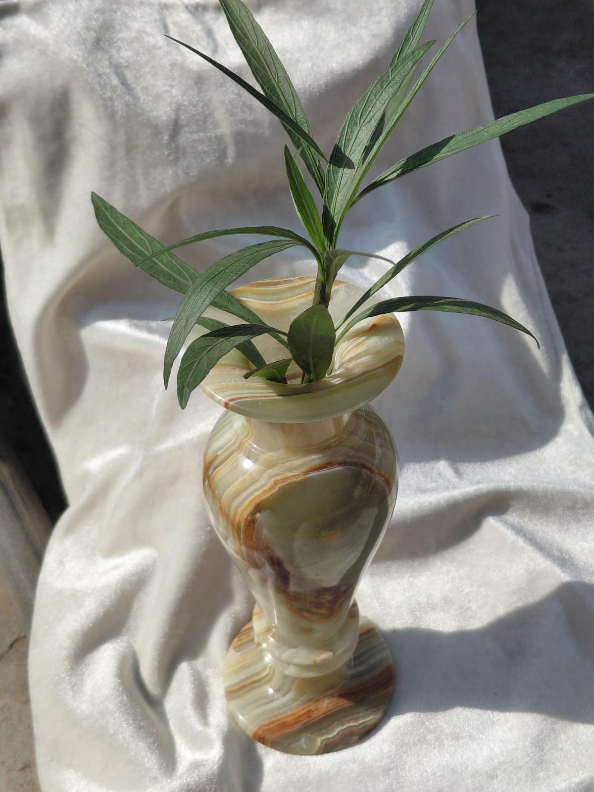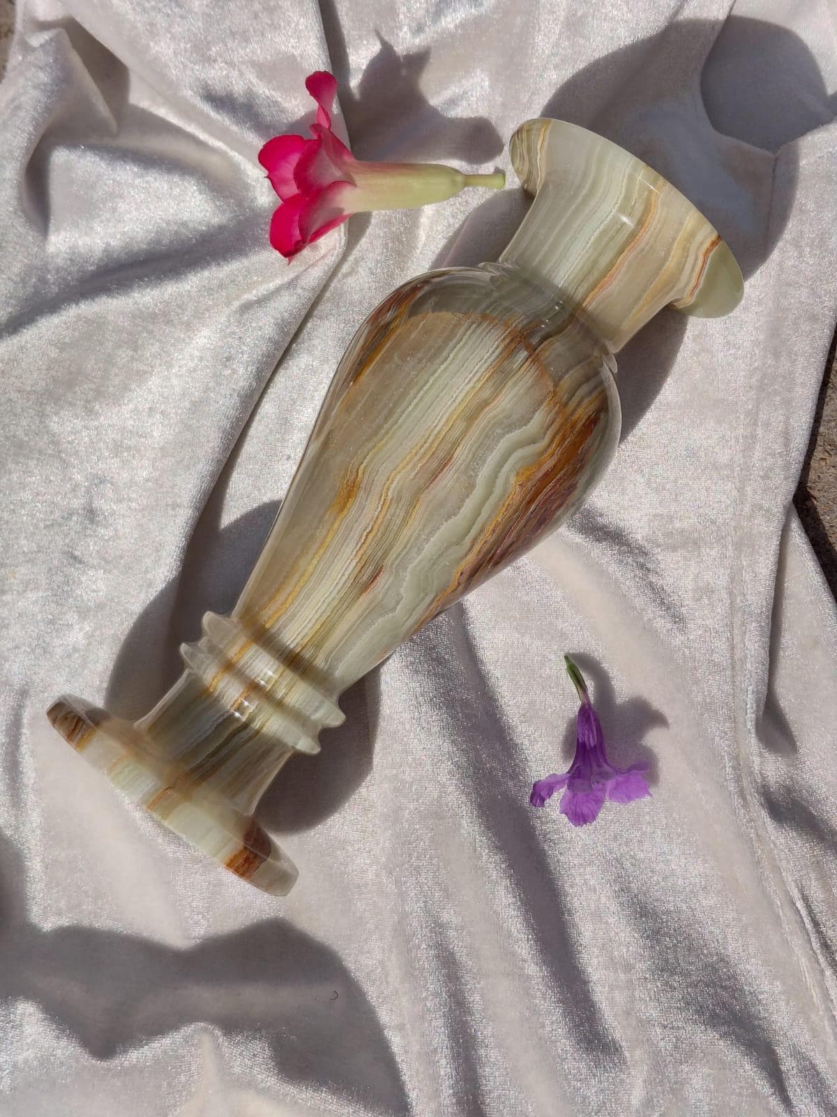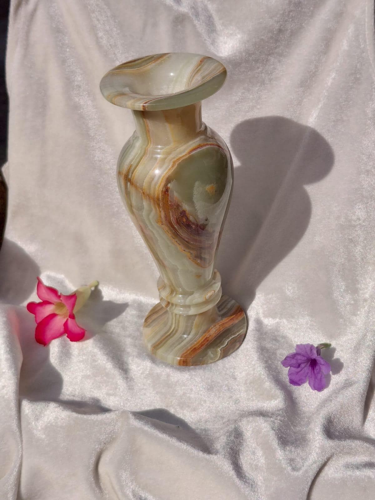 Enhance your space with this elegant and contemporary green onyx vase, combining functionality and artistry for a timeless addition to any setting.