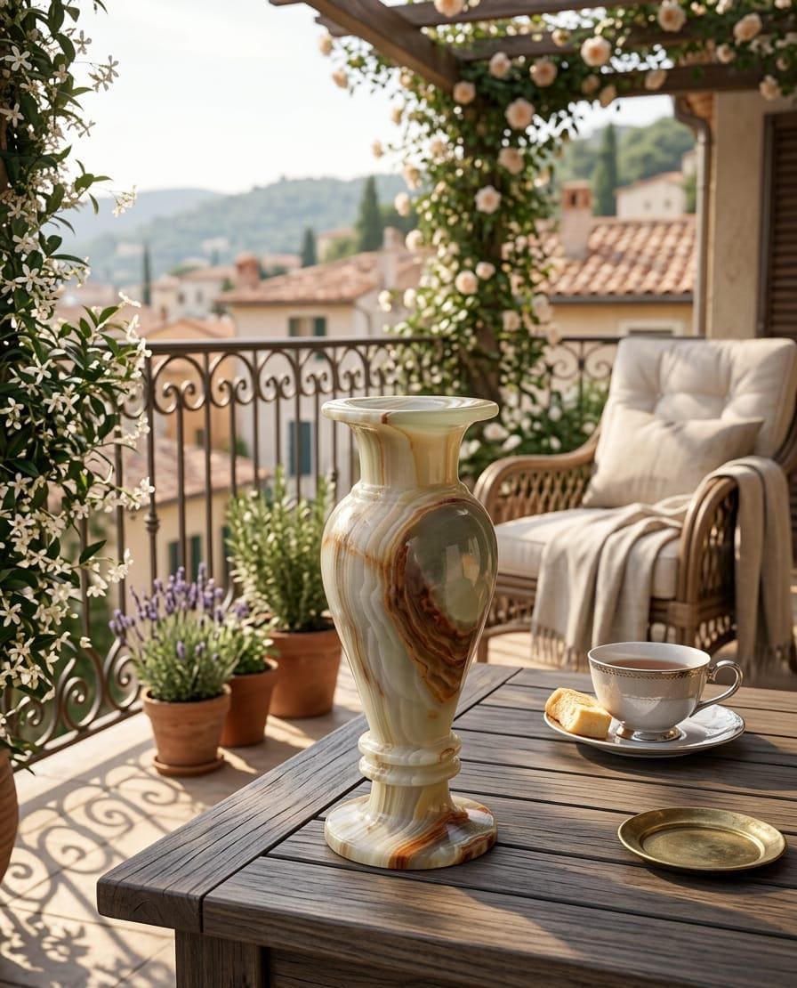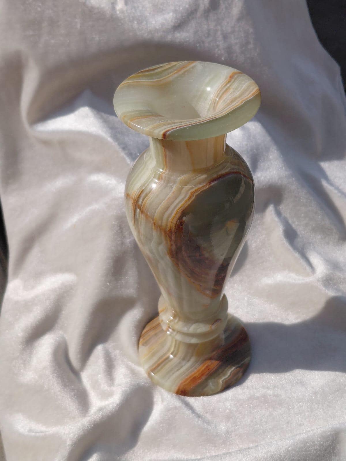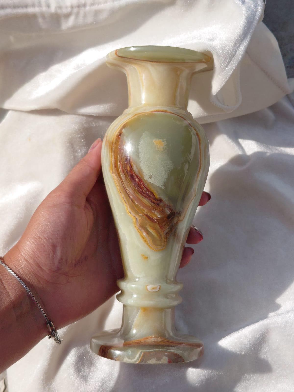 Enhance your space with this elegant and contemporary green onyx vase, combining functionality and artistry for a timeless addition to any setting.