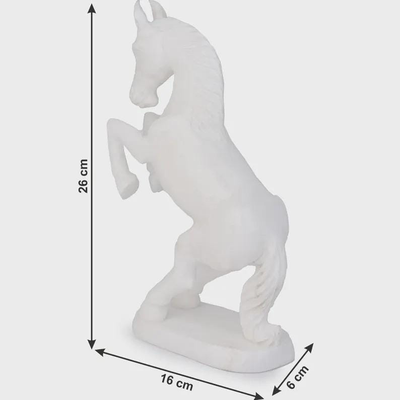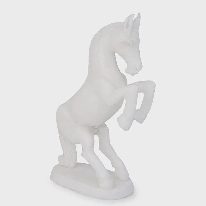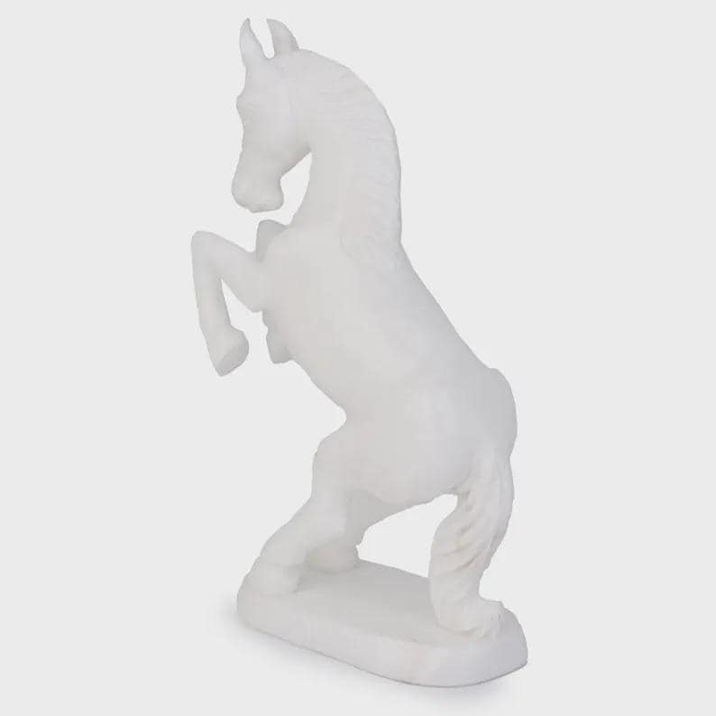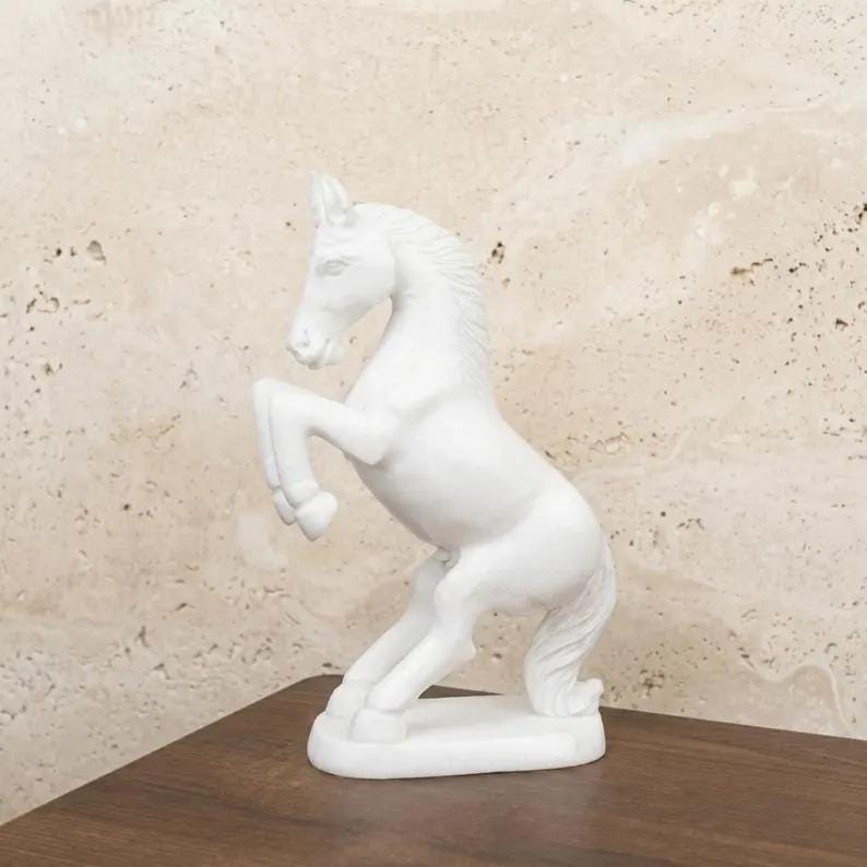 This elegant white marble horse sculpture captures the powerful stance of a rearing horse in a beautifully balanced and minimalist form. Hand-carved from solid stone, the piece showcases smooth contours and refined detailing, from the lifted forelegs to the flowing mane and tail.