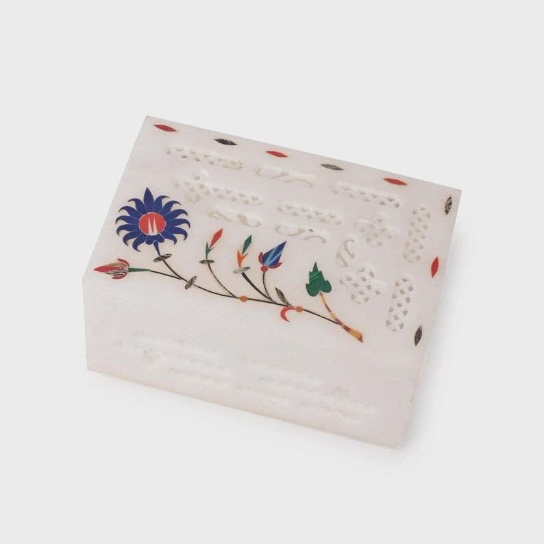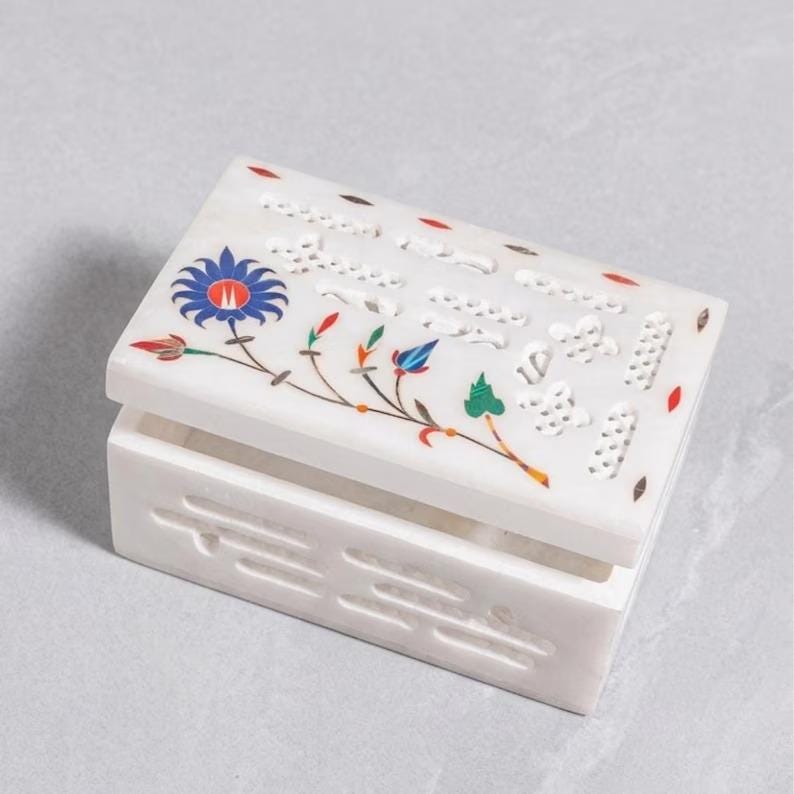 The lid is adorned with a vibrant floral motif composed of hand-cut stones in rich blue, red, green, and orange tones. Each element is carefully shaped and set into the marble, creating a durable and intricate design. Surrounding the inlay, the lid also features finely carved perforated and relief detailing, adding texture and visual depth.