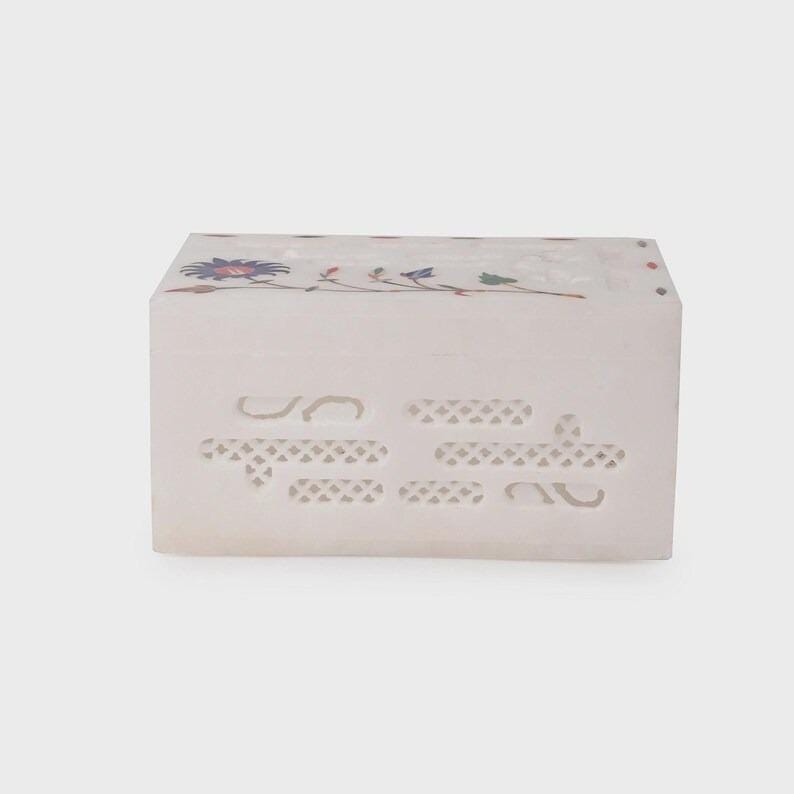 This elegant white marble jewelry box is a fine example of traditional pietra dura craftsmanship, featuring delicate floral inlay made from semi-precious gemstones.