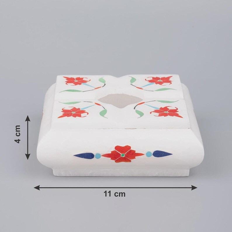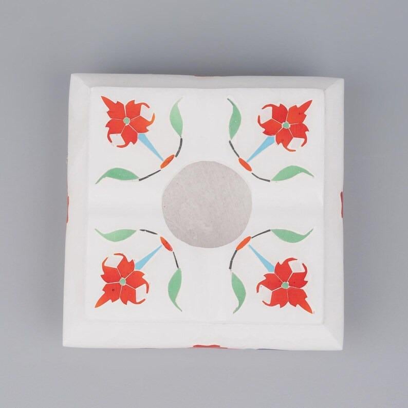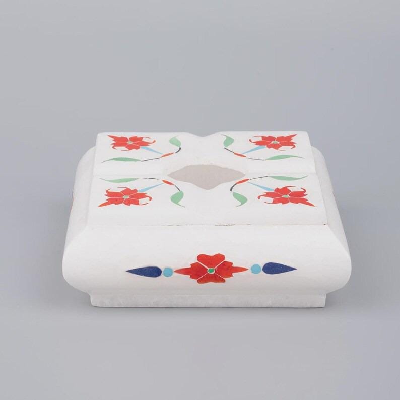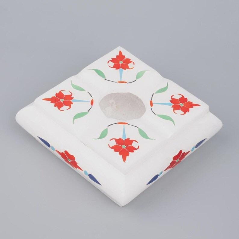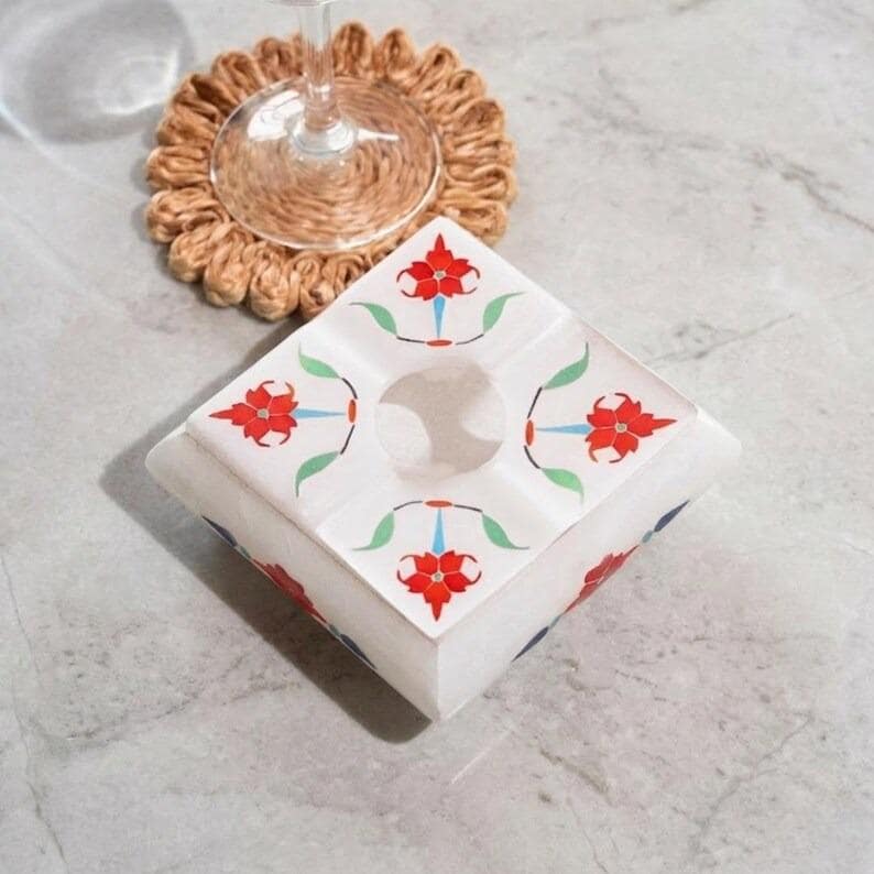 This elegant white marble ashtray features a refined square form with softly contoured edges, handcrafted using the traditional pietra dura technique. The surface is decorated with a symmetrical floral design created from semi-precious stone inlay, not paint.