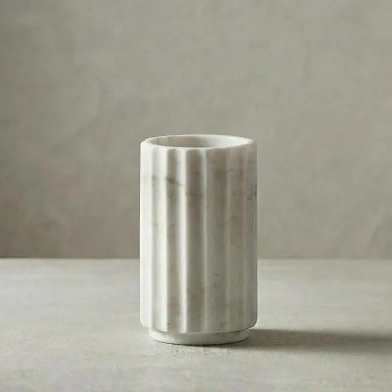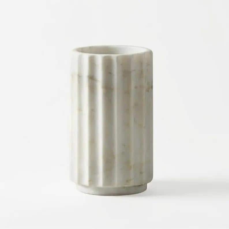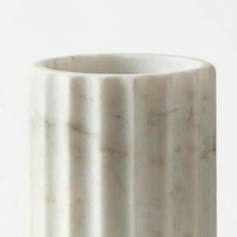 Elevate your home styling with this white marble fluted vase, a refined blend of natural beauty and modern design. Crafted from genuine marble, this vase features soft white tones with subtle veining, enhanced by a vertical ribbed texture that adds depth and sophistication.