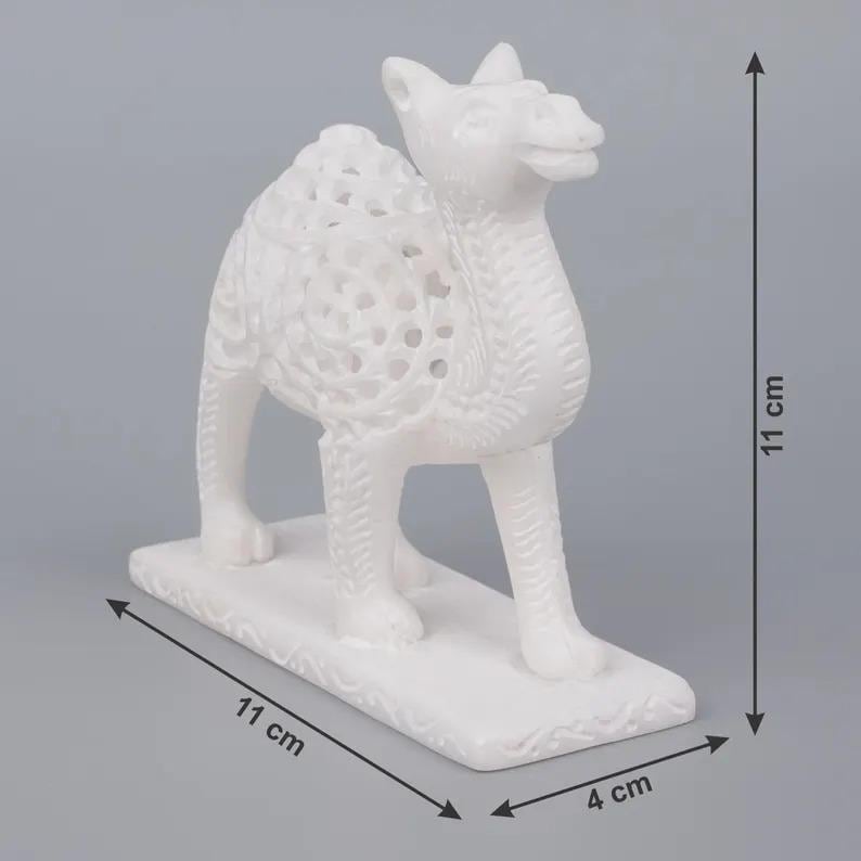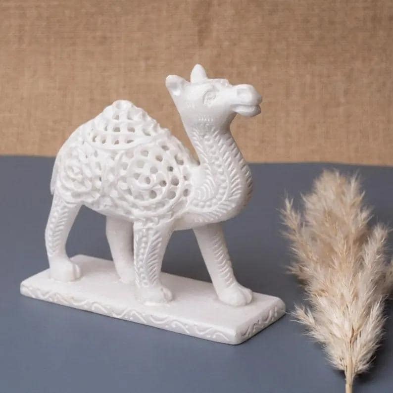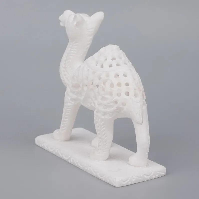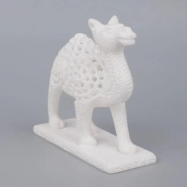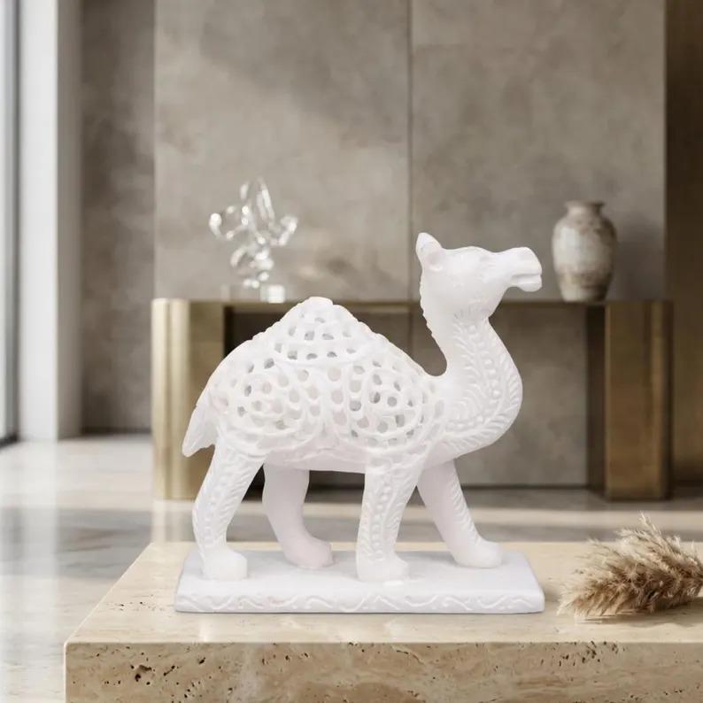 Elevate your space with this exquisite white marble camel sculpture, a timeless decorative piece that blends natural stone beauty with modern artistic design. Expertly crafted, this figurine features an intricate openwork pattern that showcases both craftsmanship and elegance.
