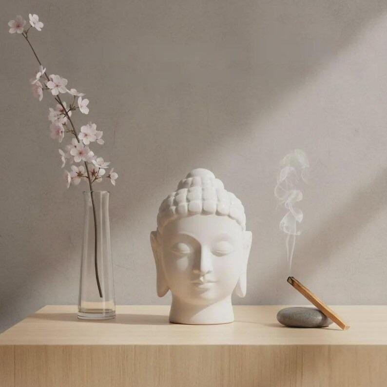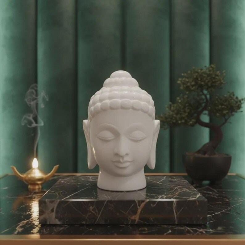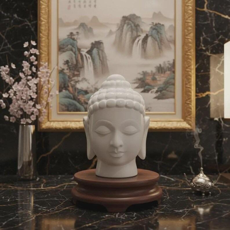 Design: Buddha head sculpture with smooth, calming facial features