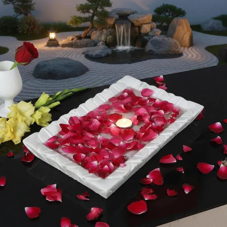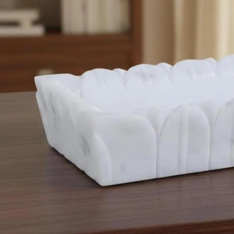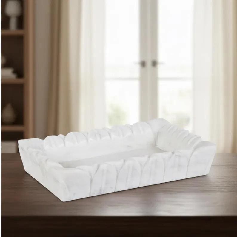 Bring timeless elegance to your space with this white marble rectangular tray, designed with a beautifully sculpted scalloped edge for a soft, artistic touch. Its clean lines and natural stone finish make it a perfect blend of modern minimalism and classic luxury.
