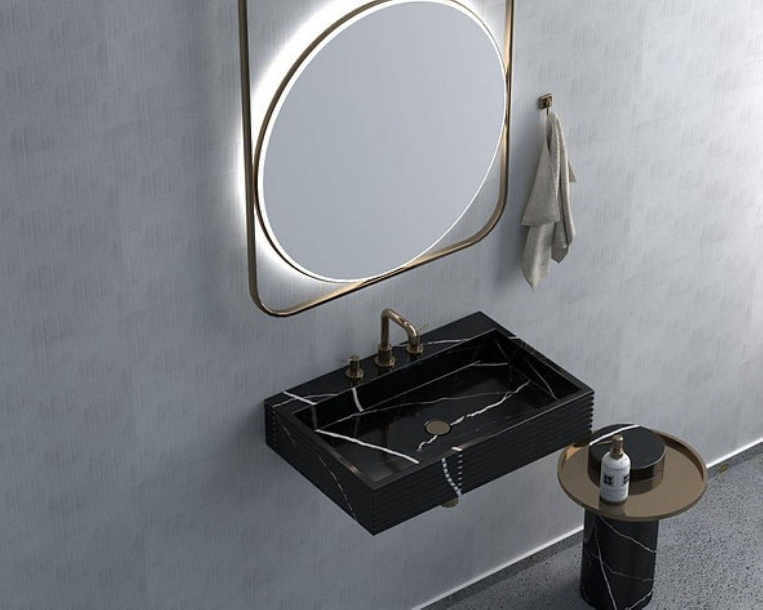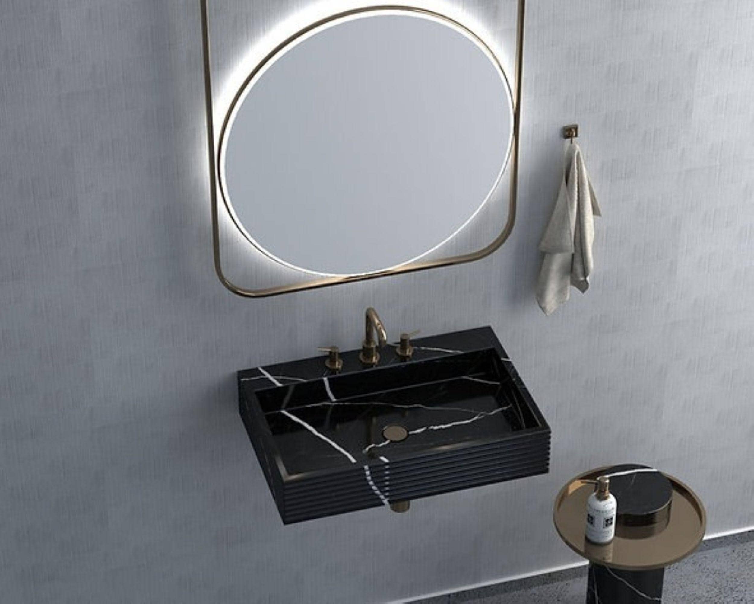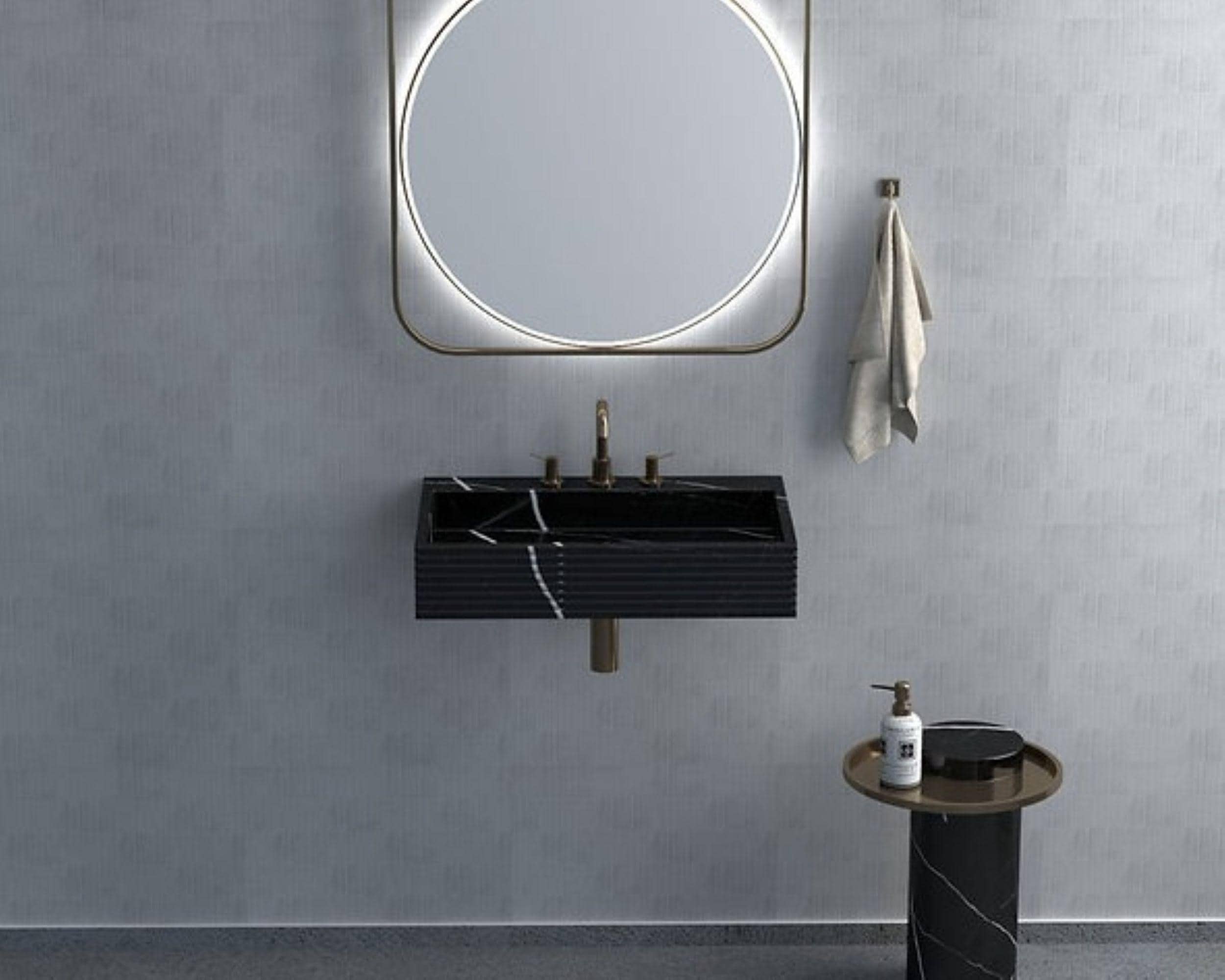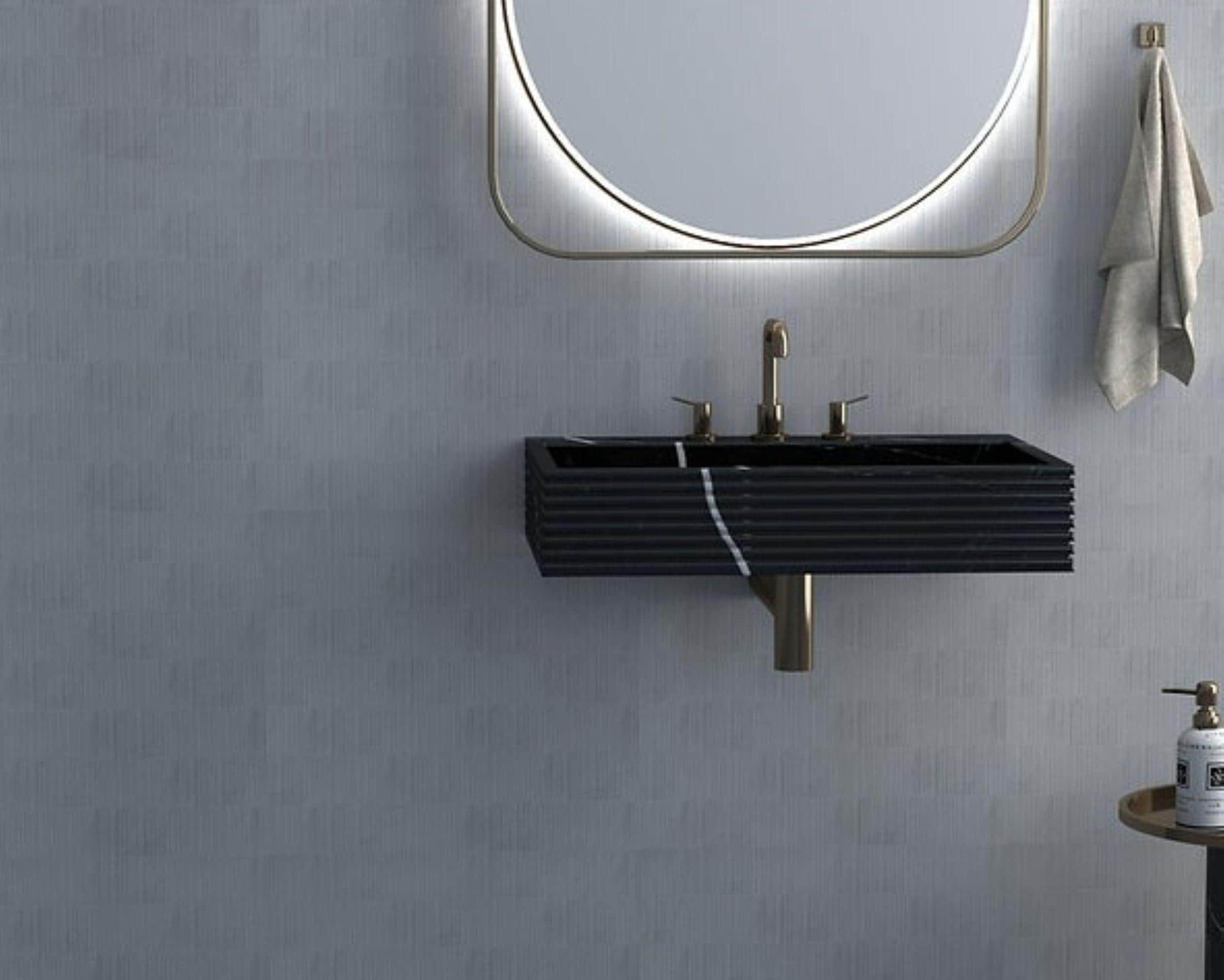 Its clean rectangular silhouette and integrated backsplash create a sleek, architectural look, while the fluted side detailing adds subtle texture and depth. Paired with warm metallic fixtures, this piece instantly elevates any bathroom into a refined, spa-like space.