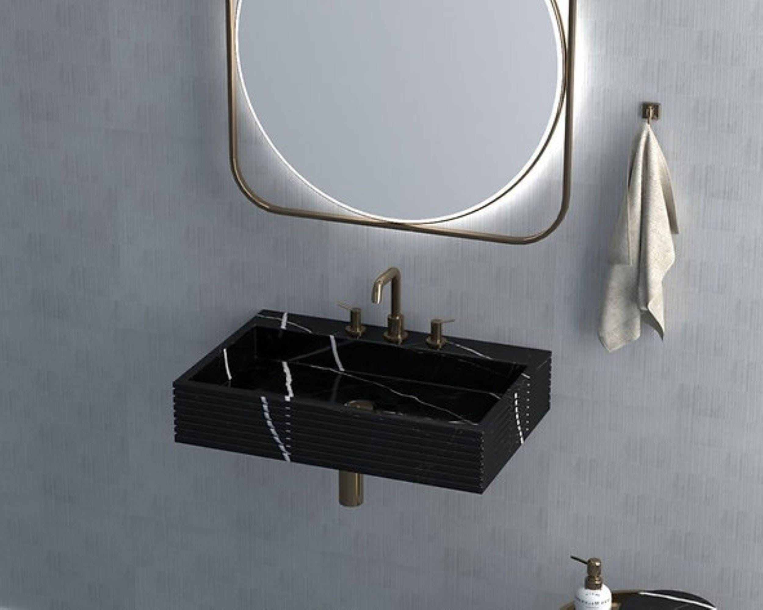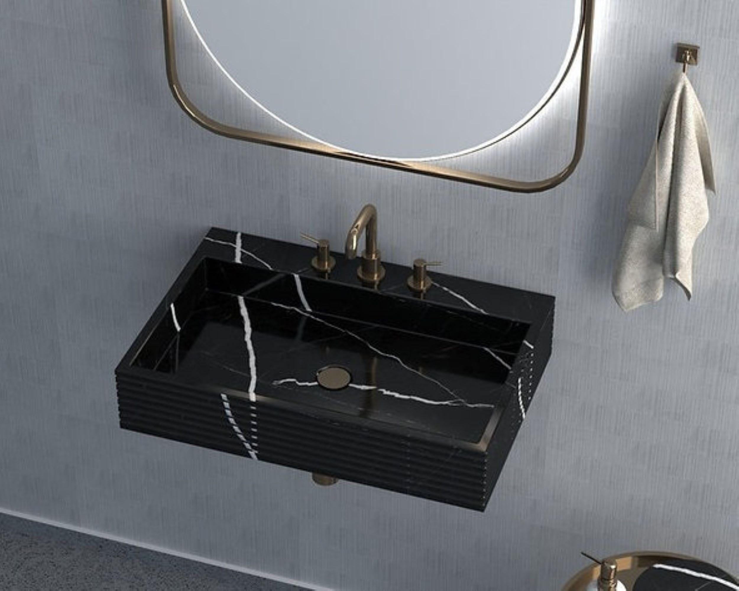 Make a bold statement with this striking black marble wall-mounted sink, designed for modern interiors that value both form and function. Crafted from solid natural stone, this floating vanity basin features dramatic white veining that contrasts beautifully against the deep black surface.