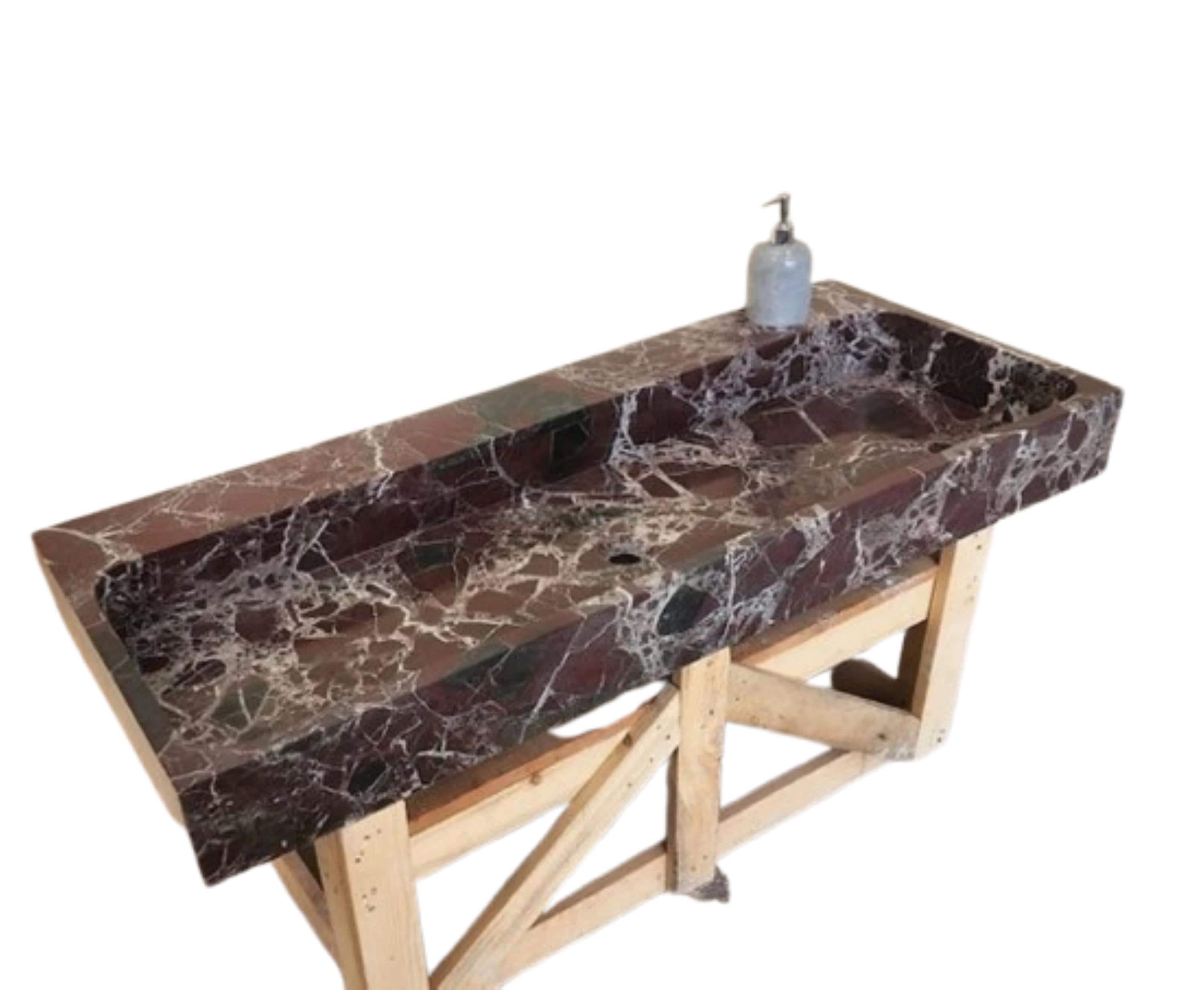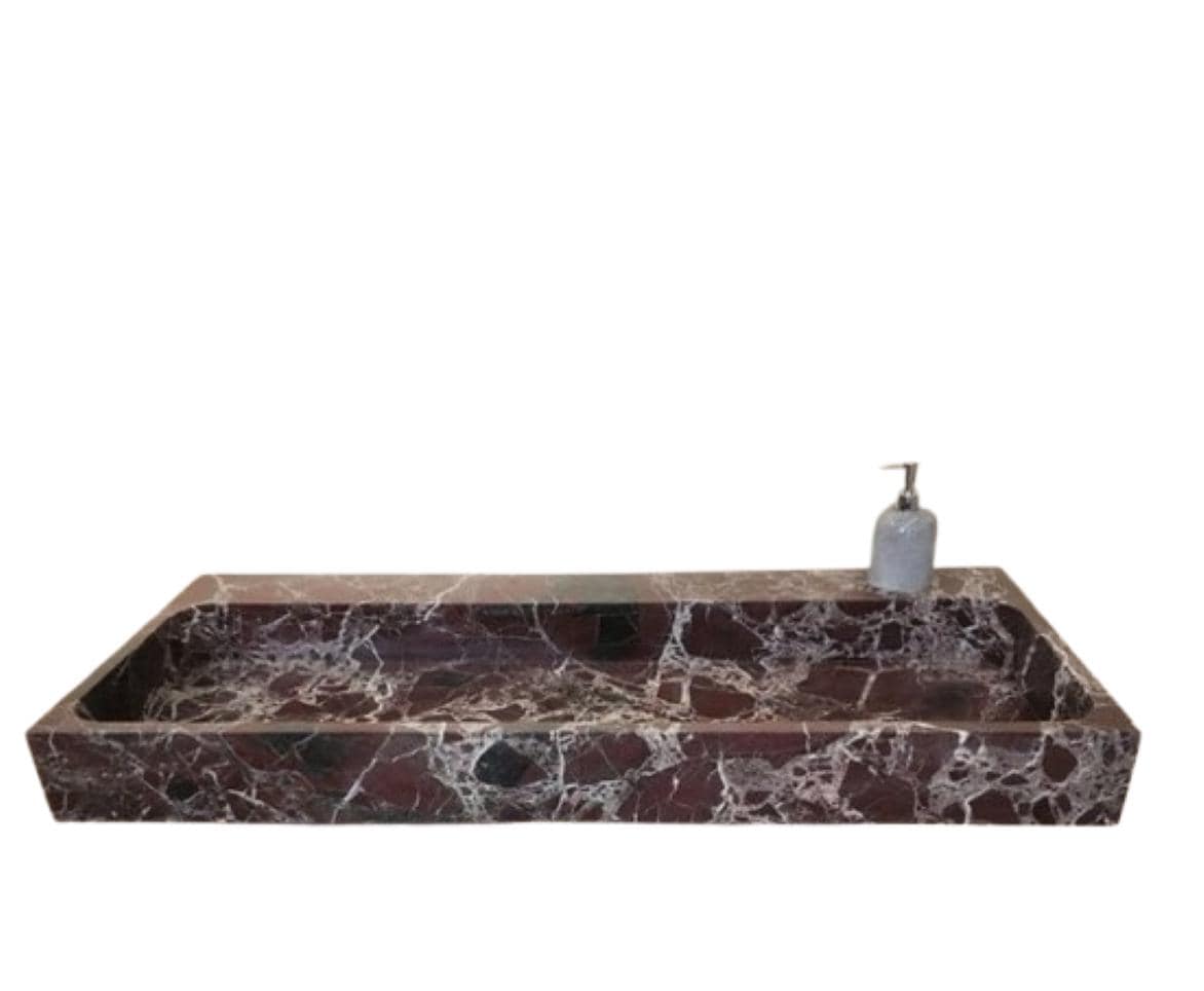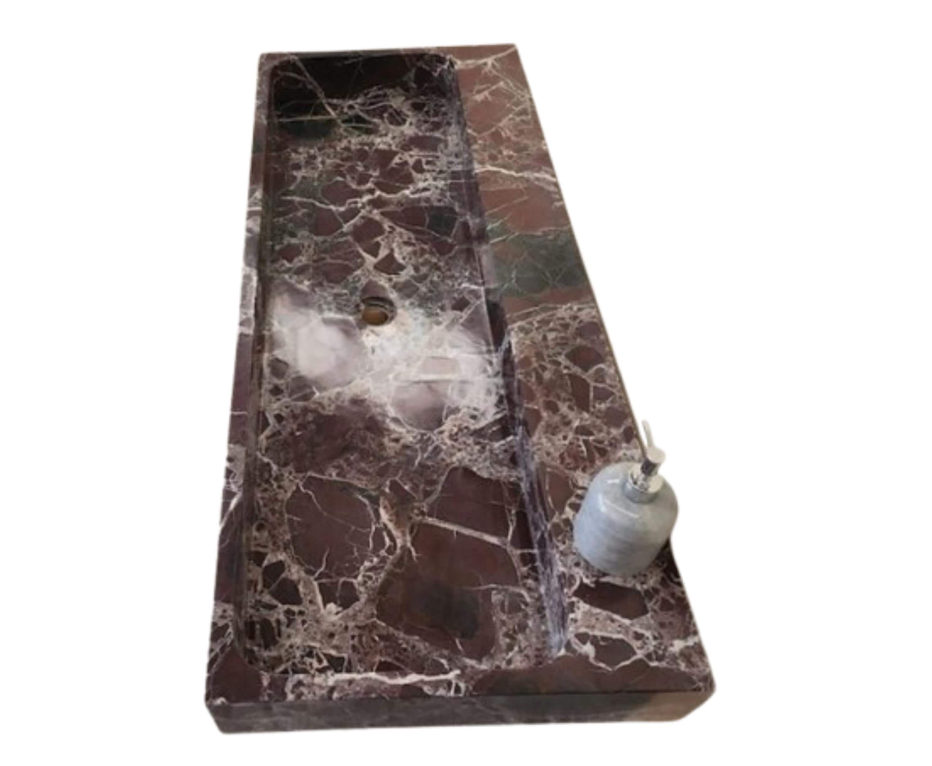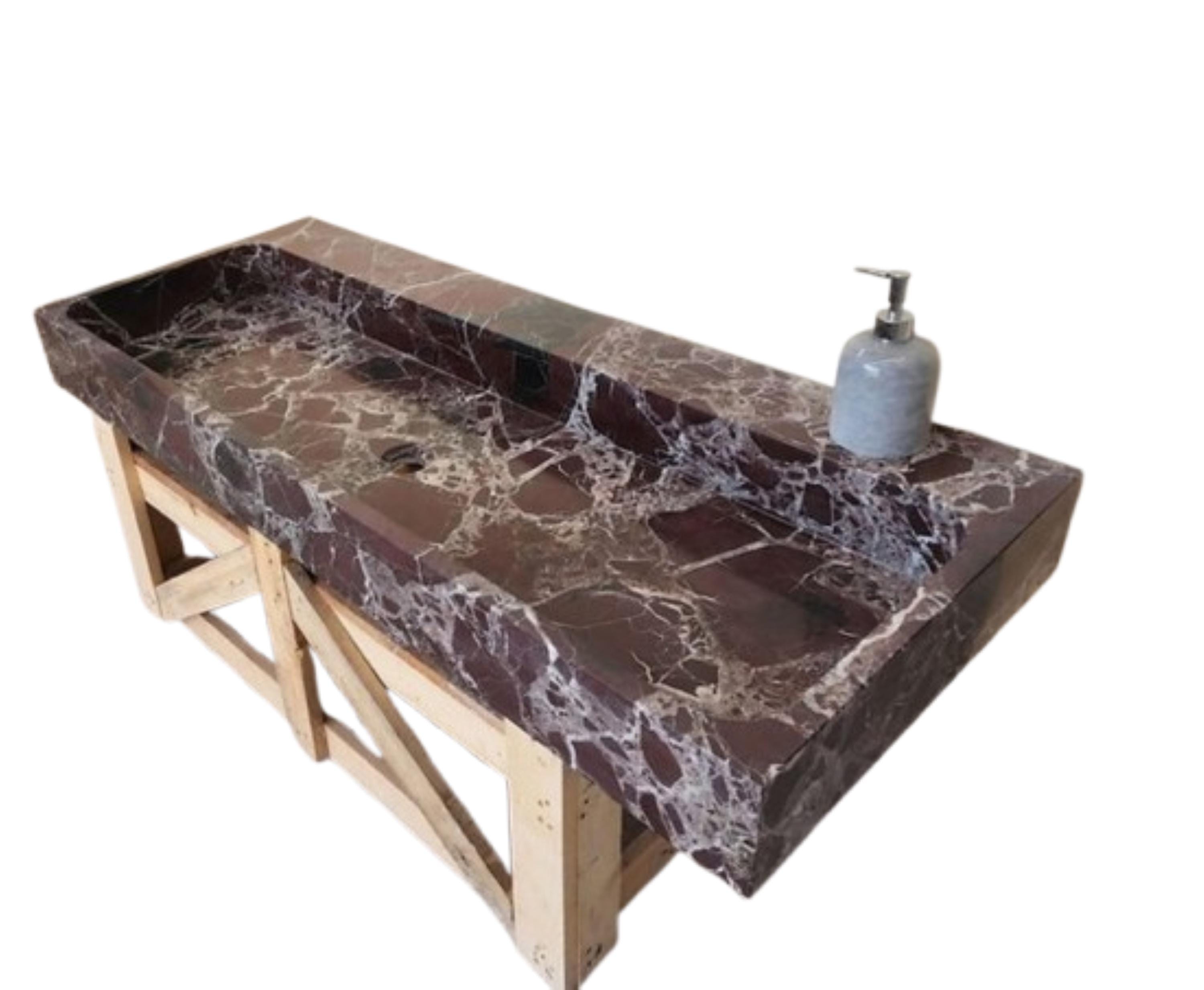 Elevate your bathroom with this stunning handcrafted marble trough sink, carved from a single block of richly veined natural stone. Featuring deep burgundy and chocolate tones with striking white veining, this statement piece blends luxury with raw, organic beauty. The elongated rectangular design offers a spacious basin, making it ideal for double-user setups or high-end residential and commercial bathrooms.