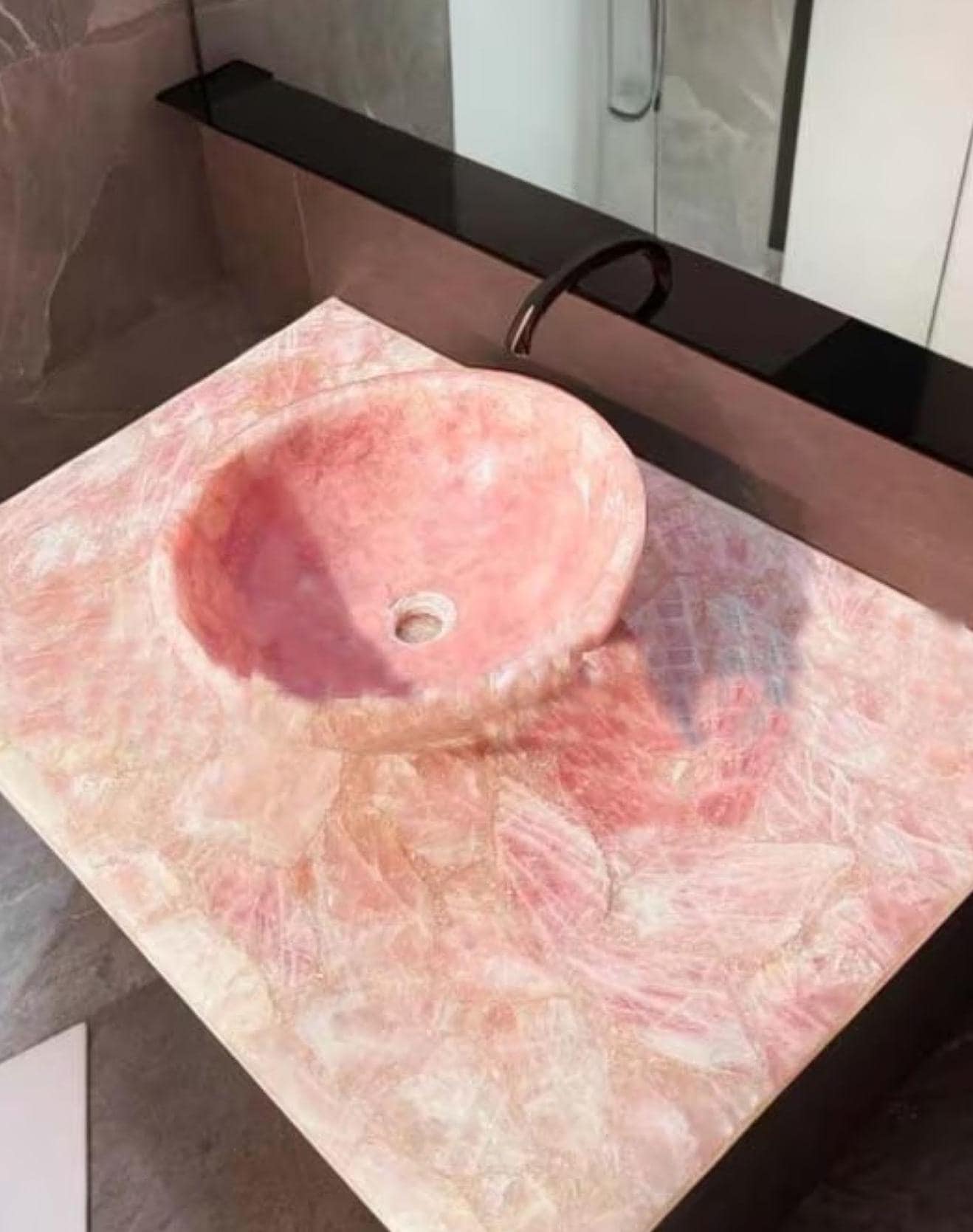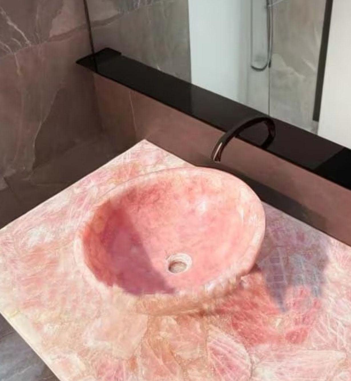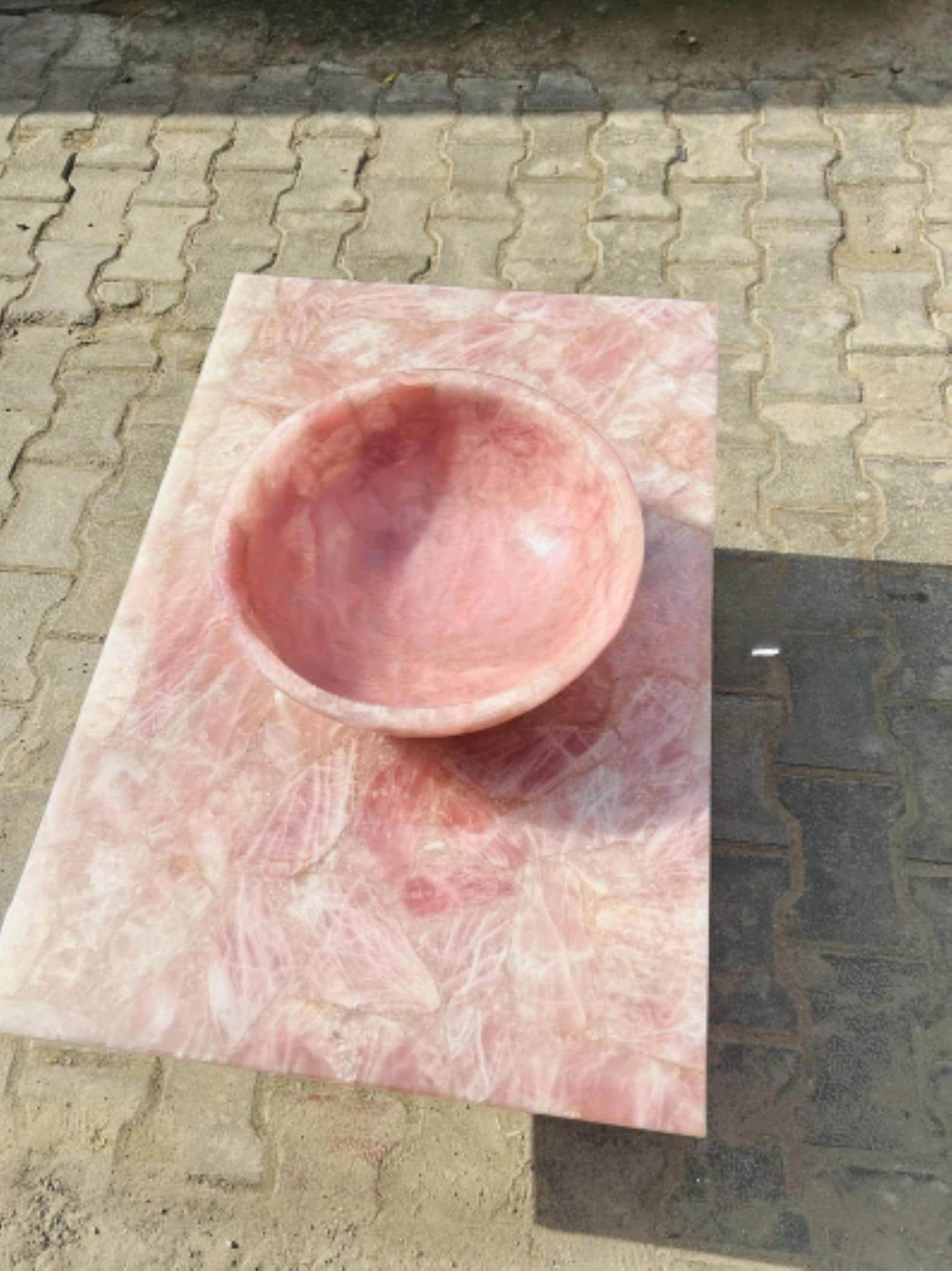 Elegant Rose Quartz Bathroom Sink with Matching Table – Semi Precious Stone Set