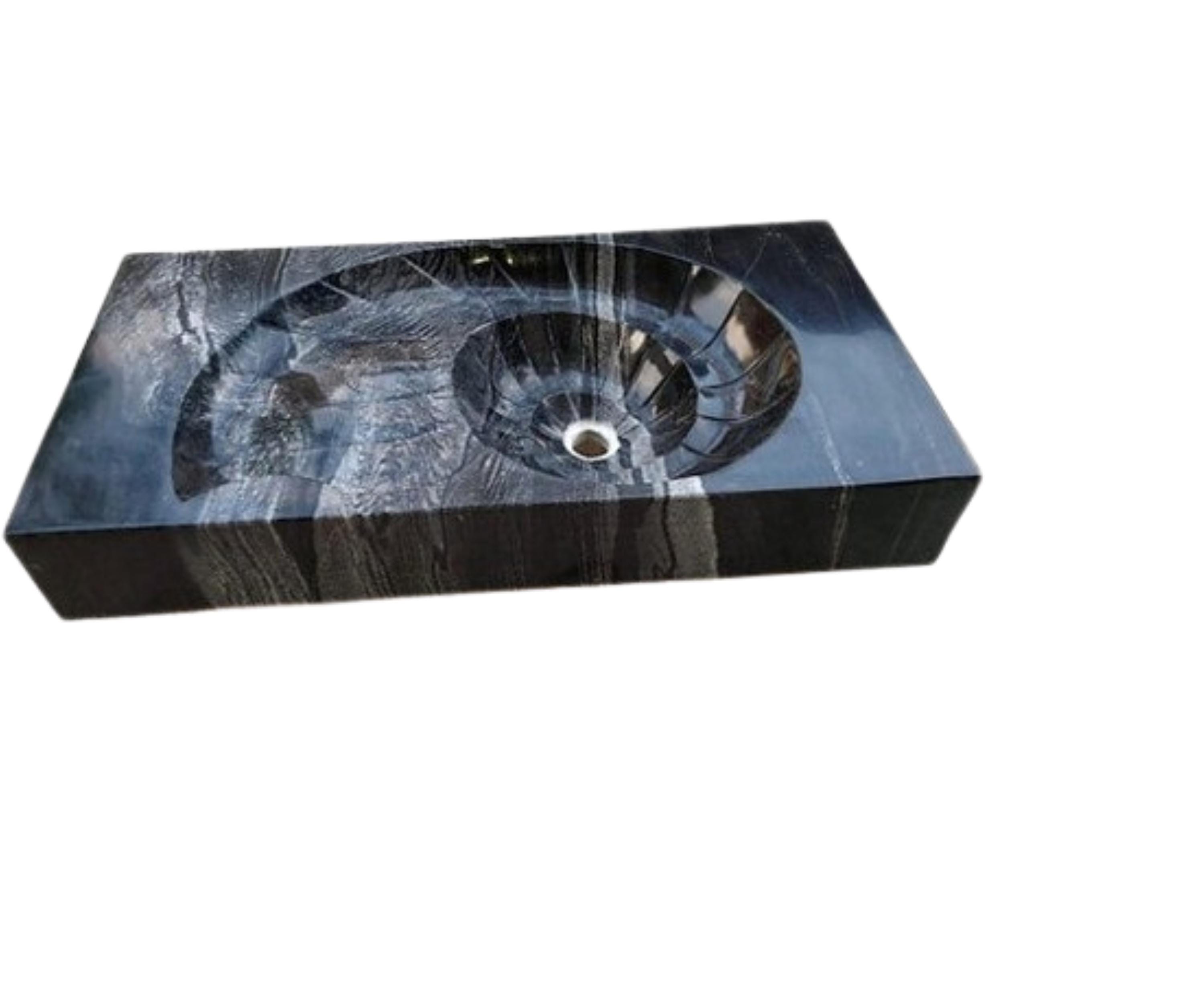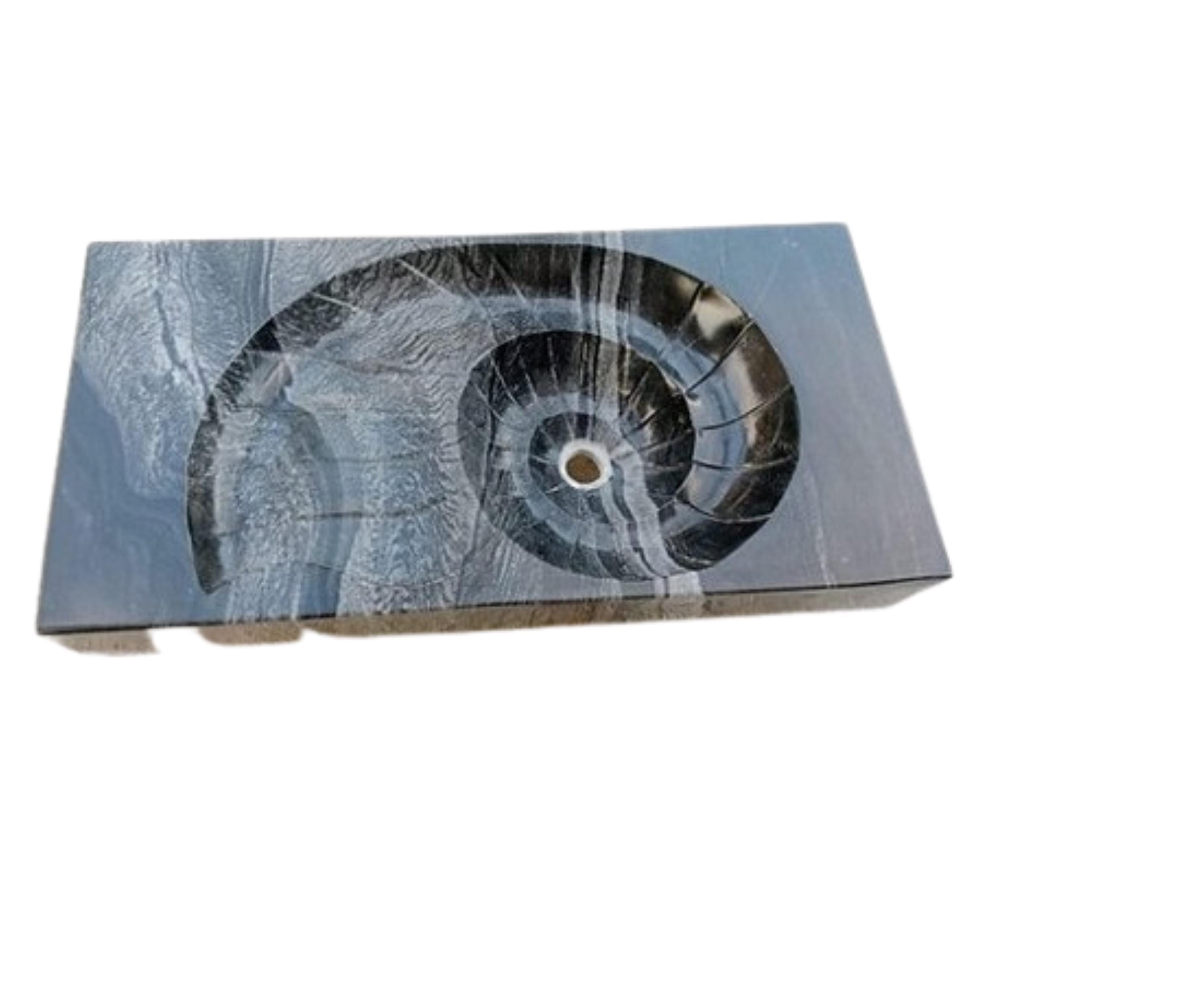 Elevate your bathroom with this striking black marble ammonite sink, where natural stone luxury meets ancient fossil artistry. Crafted from polished black marble, this piece features a beautifully preserved ammonite fossil, creating a bold spiral focal point that adds depth, texture, and timeless character.
