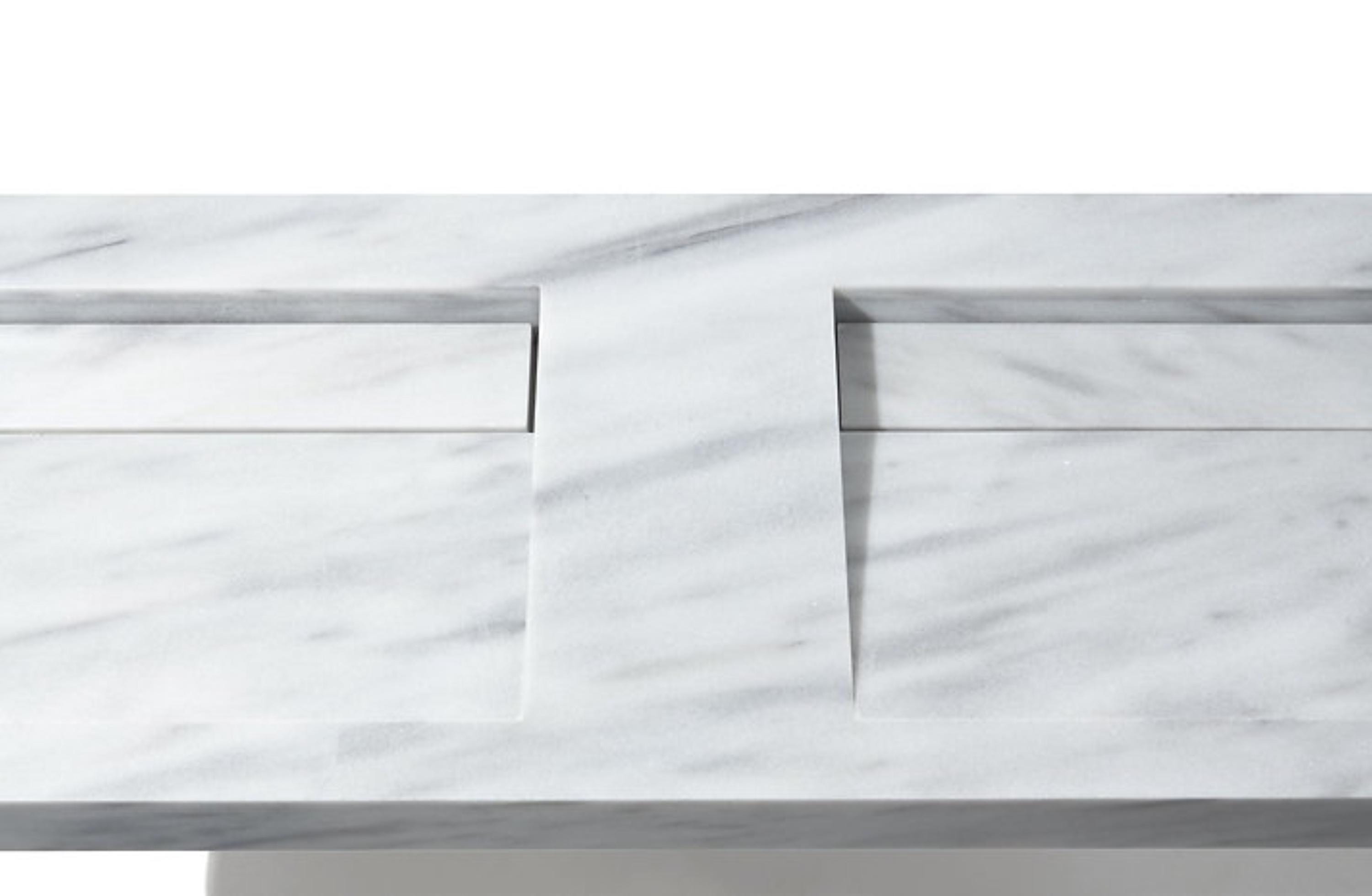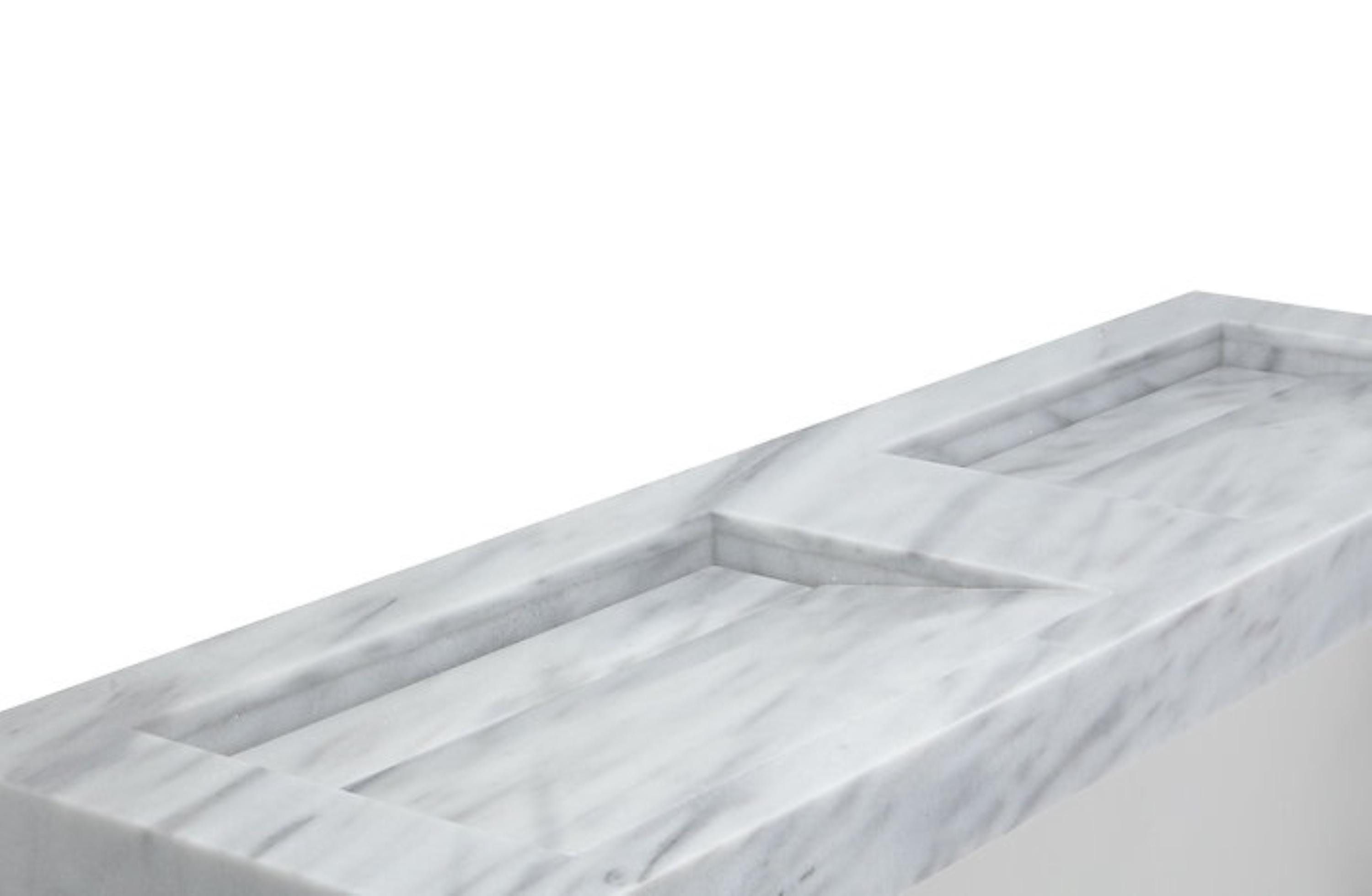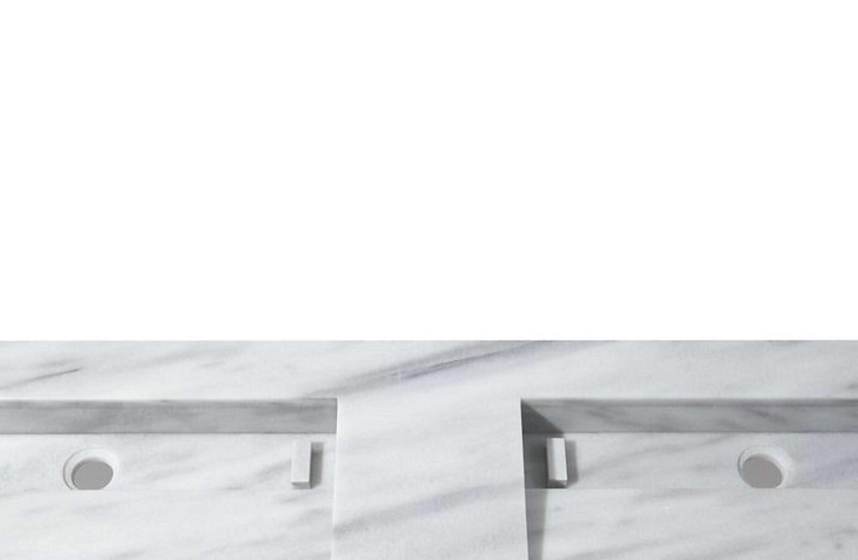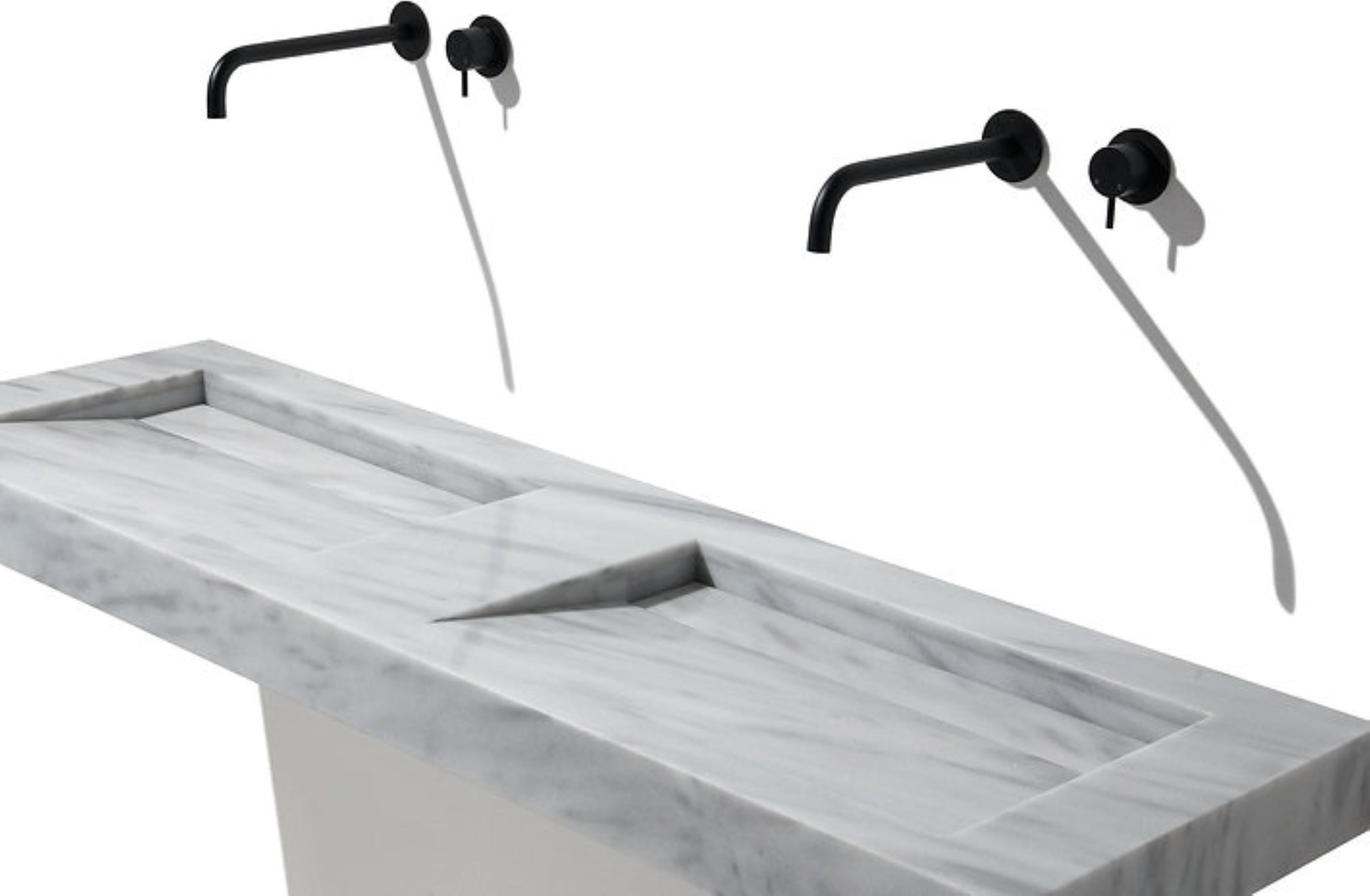 Elevate your bathroom with this striking modern double sink vanity, crafted from solid stone with a clean, architectural aesthetic. Designed for both functionality and visual impact, this piece features two geometric basins seamlessly carved into a single slab, creating a sculptural centerpiece for contemporary interiors.