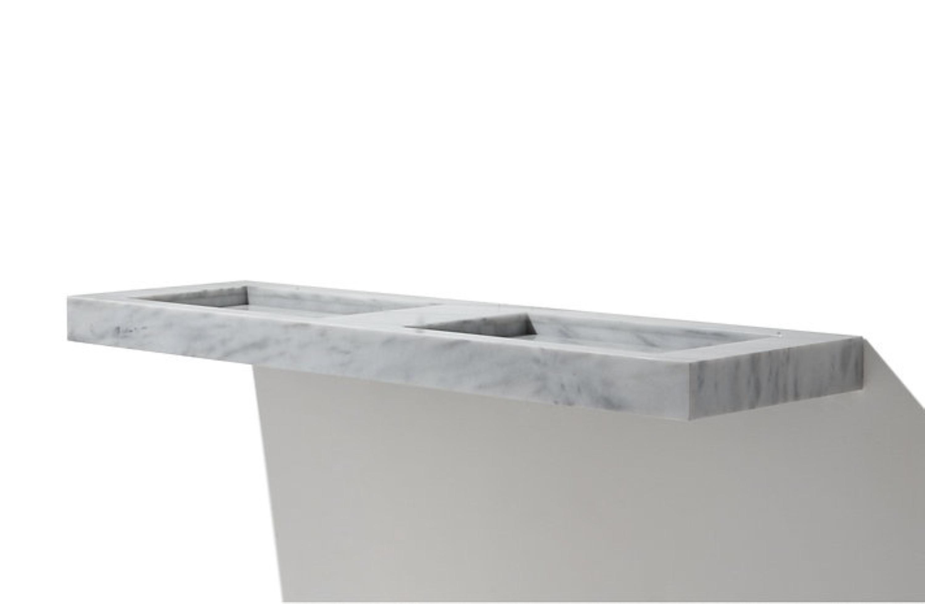 The sharply angled inner basins provide efficient water flow while adding a bold, minimalist design element. Paired with sleek, elevated faucet mounts, this vanity blends luxury with practicality—perfect for modern homes, boutique hotels, or high-end renovations.