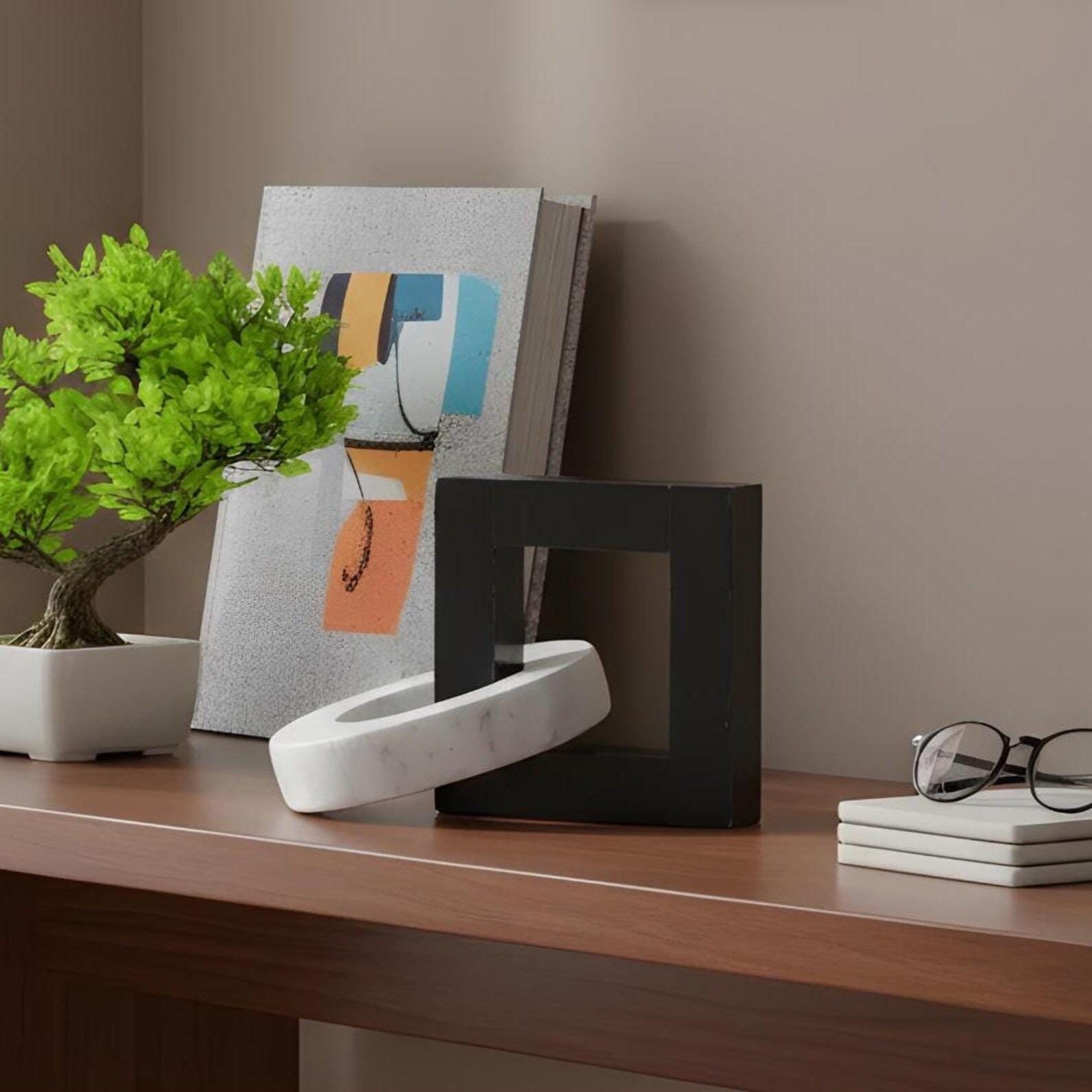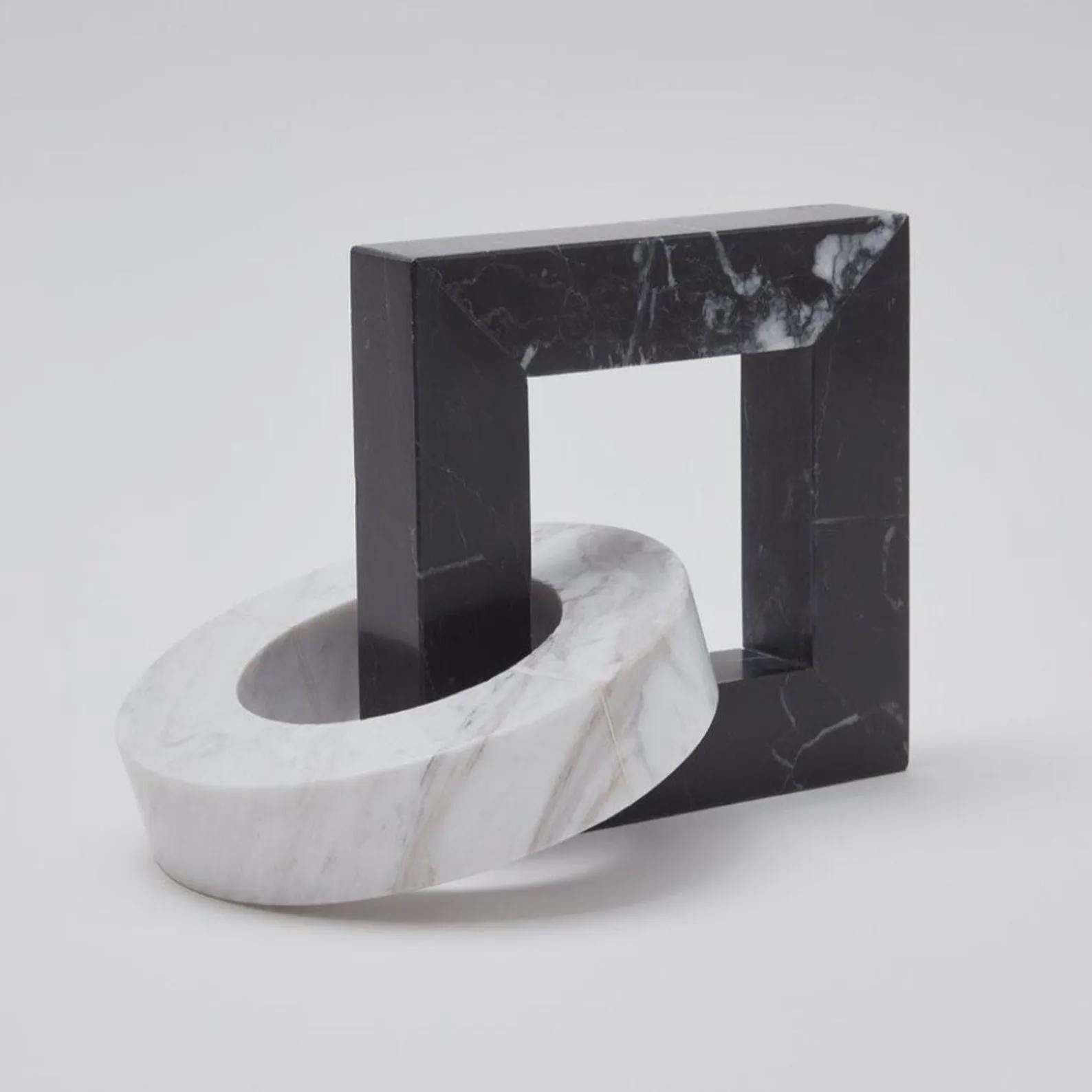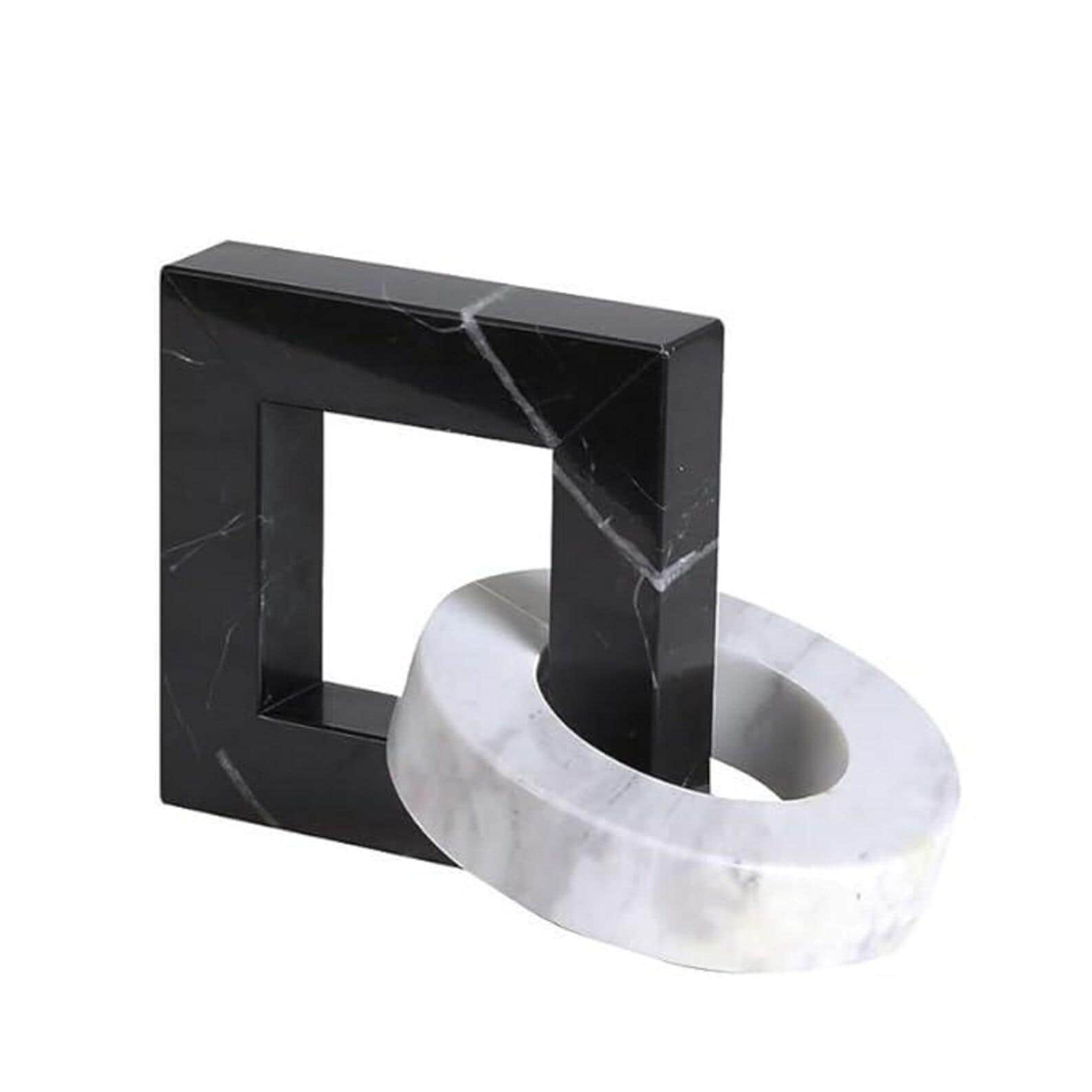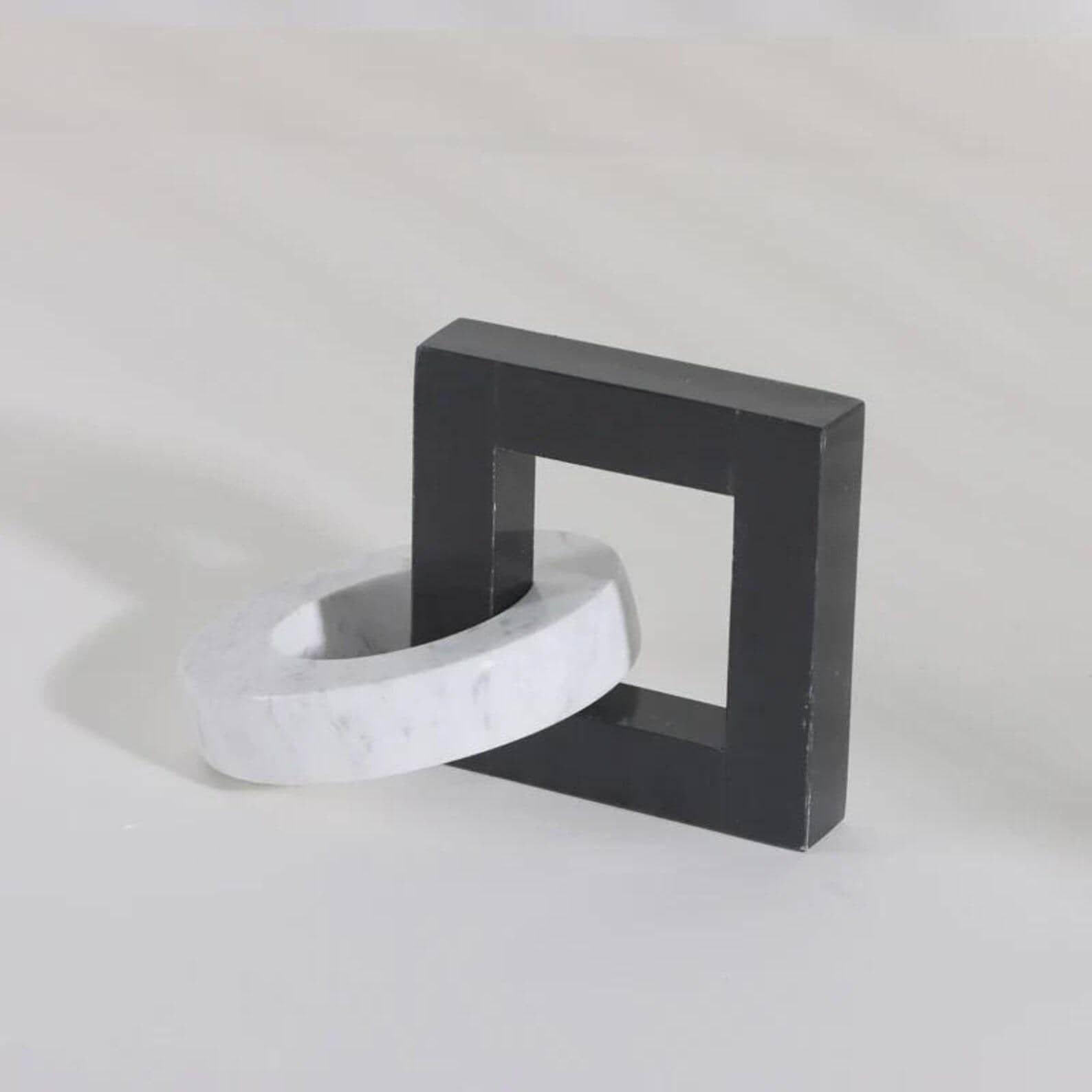 Elevate your interior with this striking geometric marble sculpture, a perfect blend of modern design and timeless natural materials. Featuring a bold black square frame intertwined with a smooth white marble ring, this piece creates a captivating visual contrast and sculptural balance.