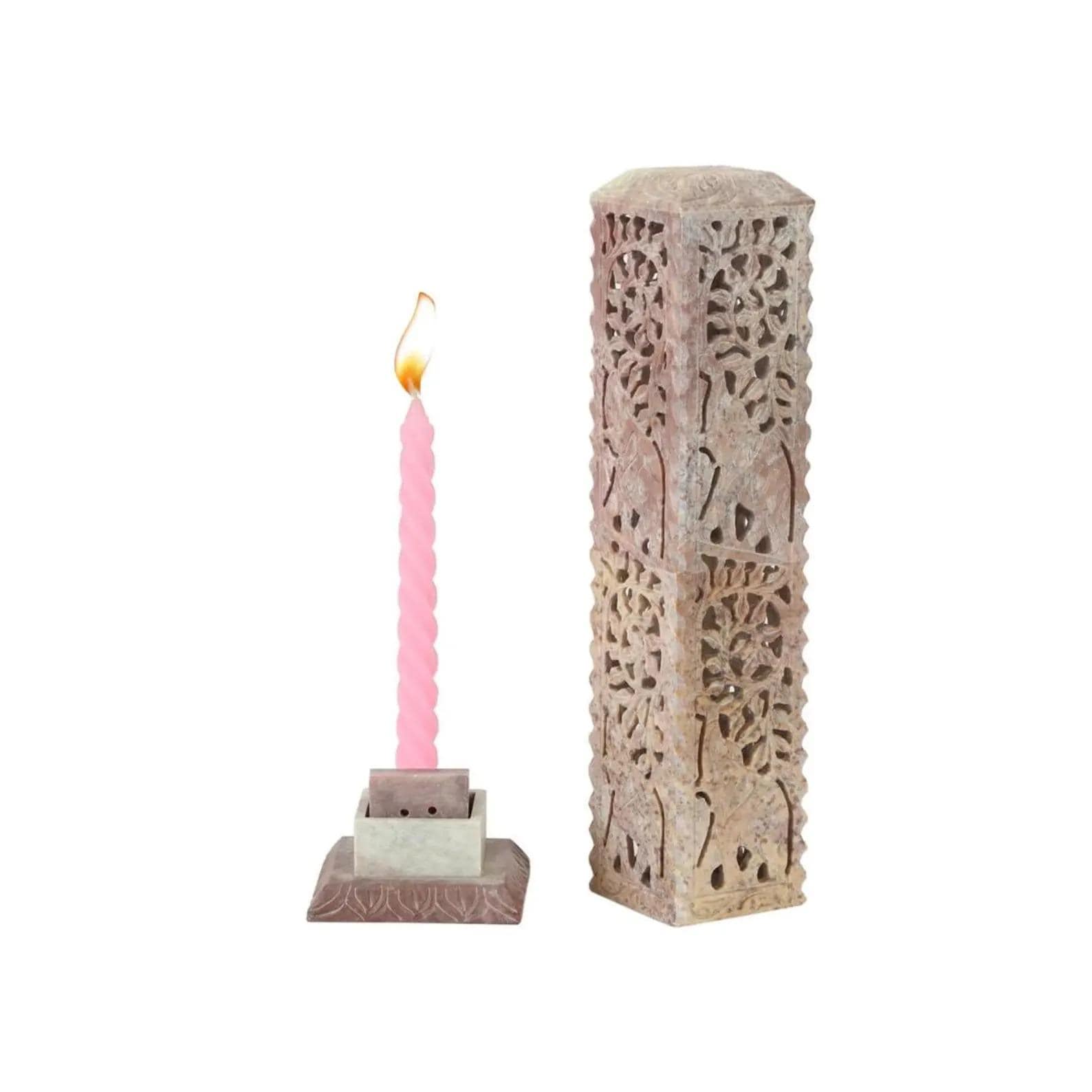 The decorative carved tower cover enhances the experience by softly filtering smoke and candlelight, creating a peaceful and cozy atmosphere.