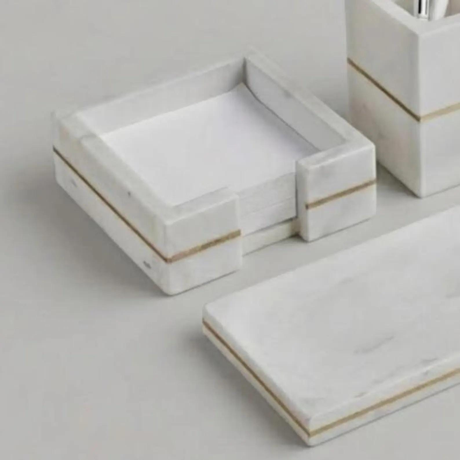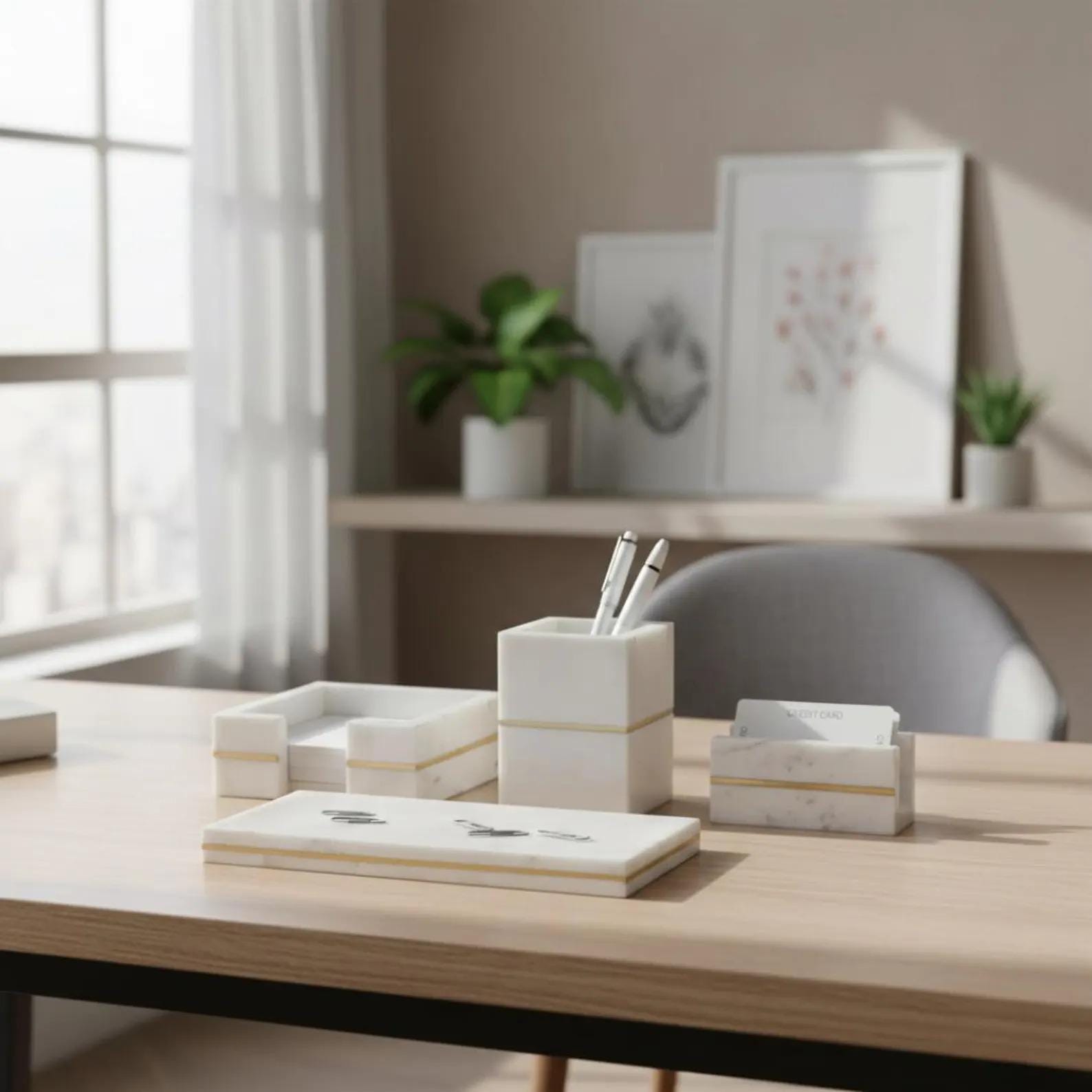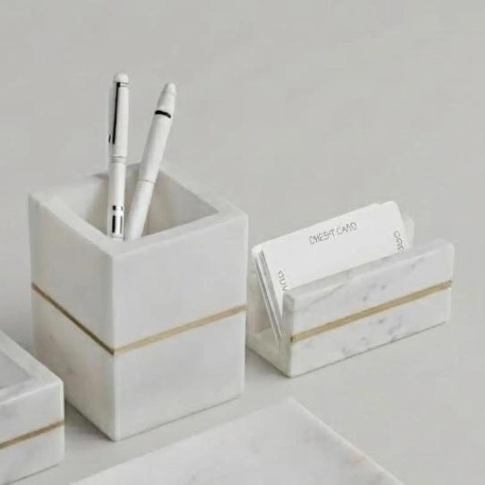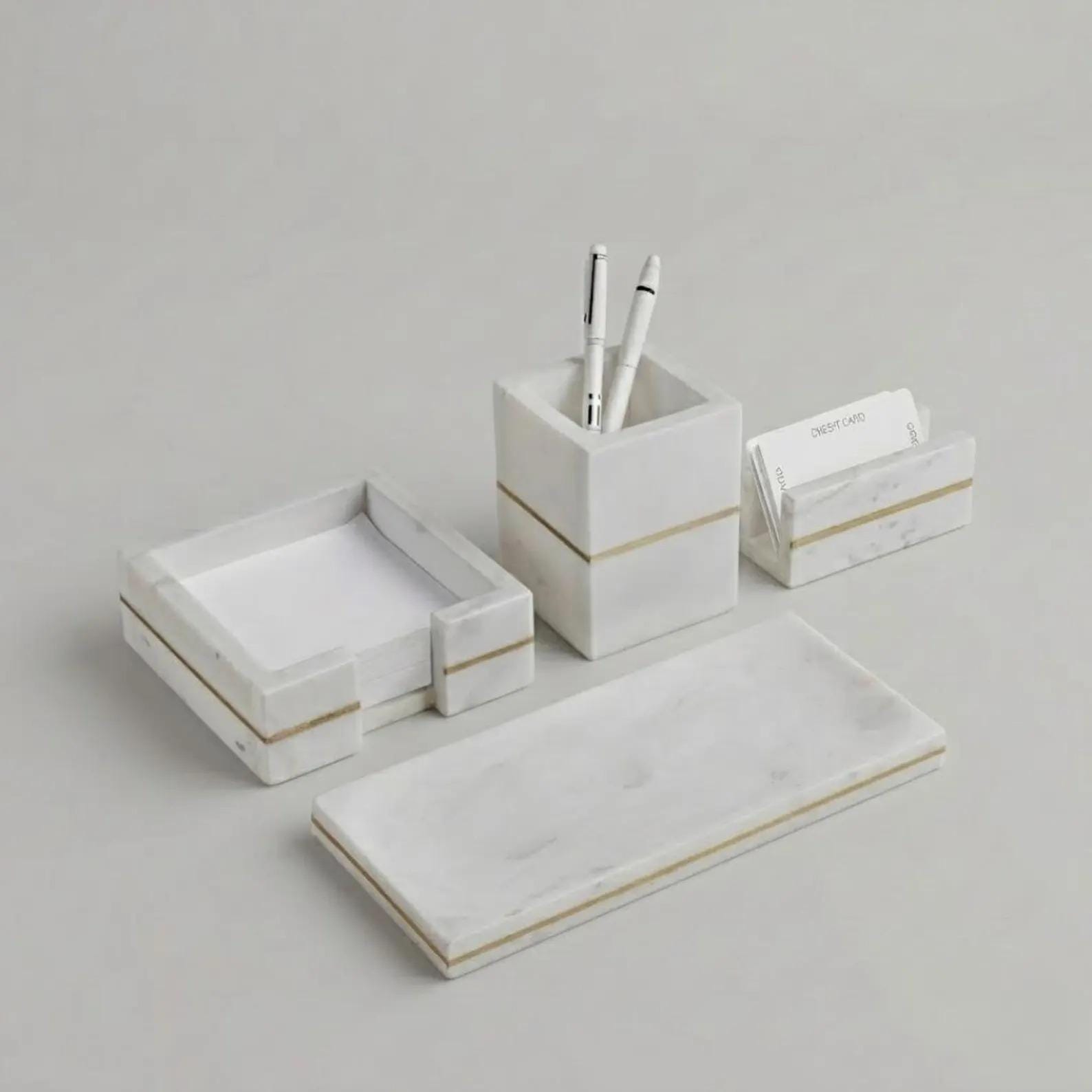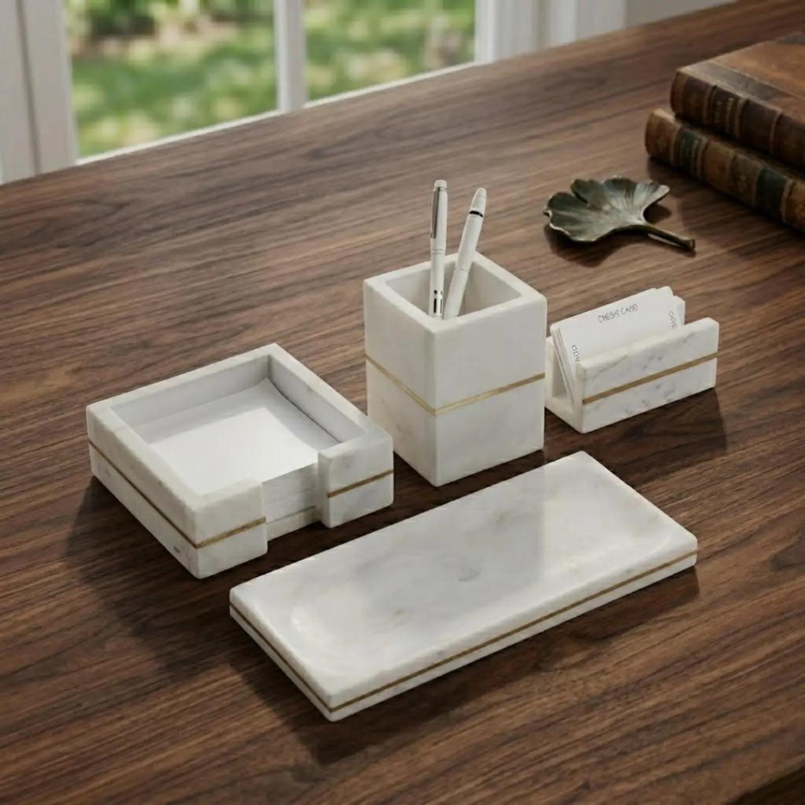 Upgrade your workspace with this white marble desk organizer set with brass inlay, a perfect blend of luxury, functionality, and minimalist design. Crafted from natural marble and accented with sleek brass detailing, this set adds a refined and modern touch to any desk.