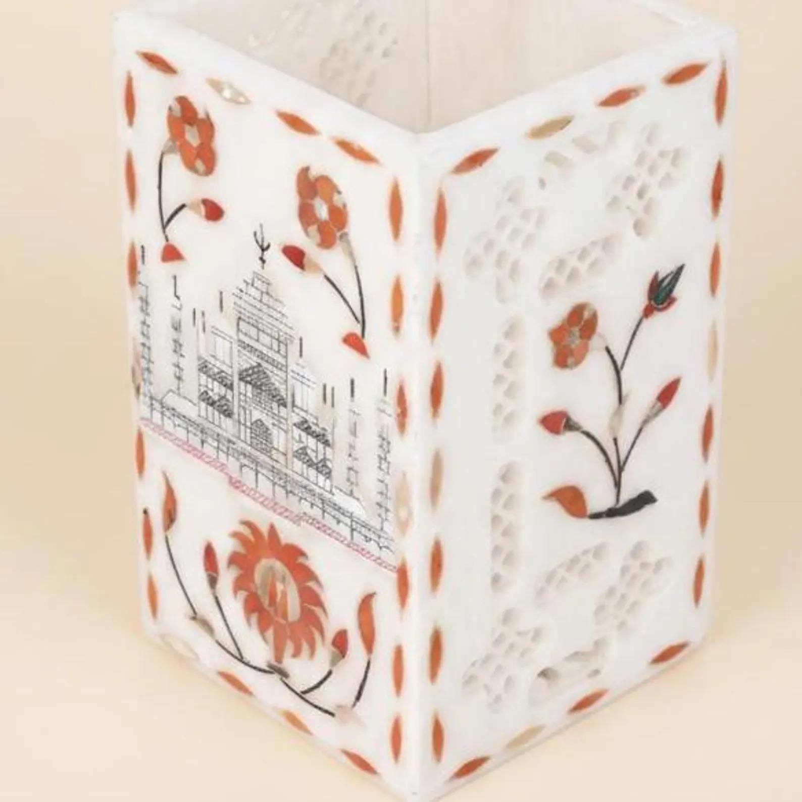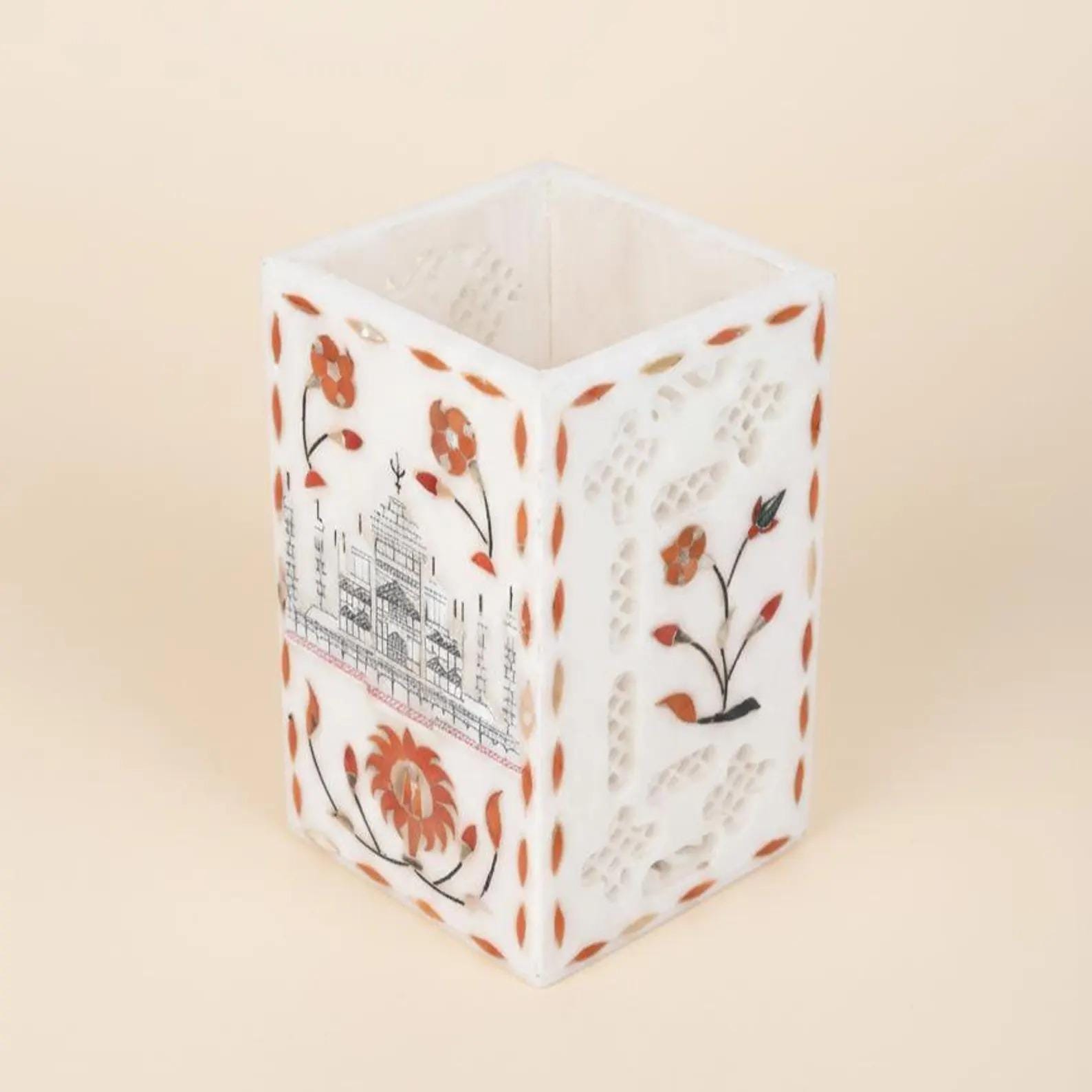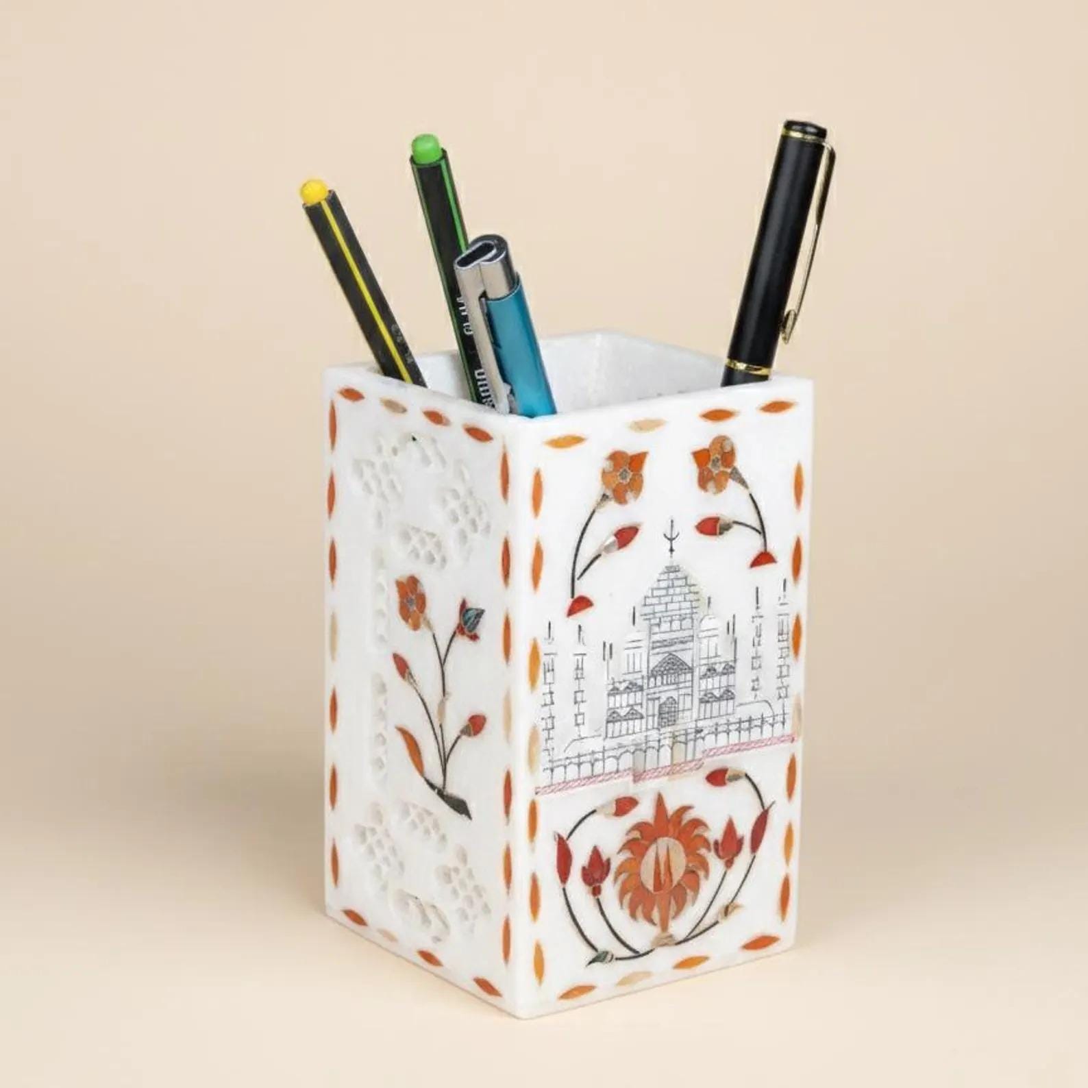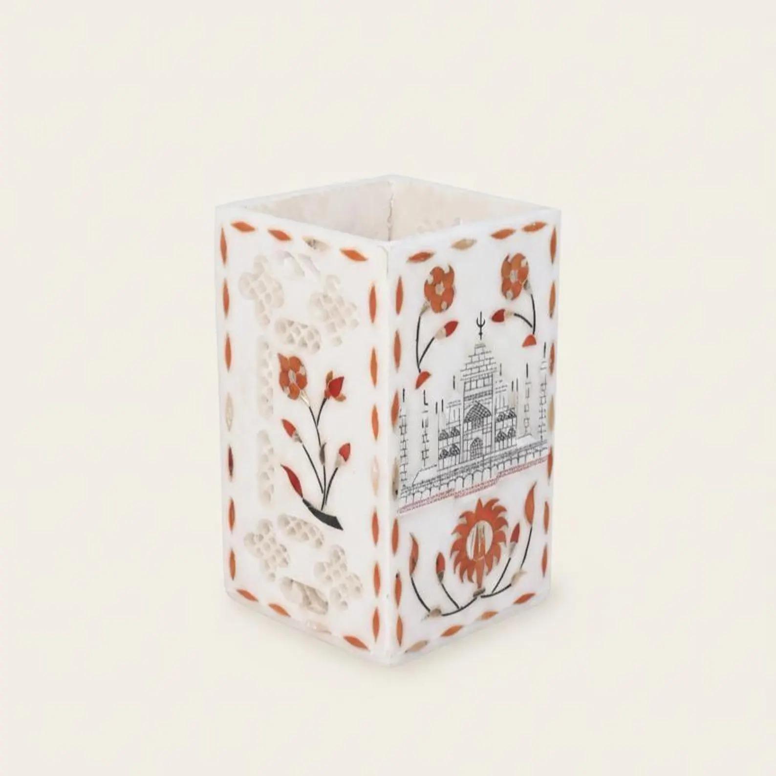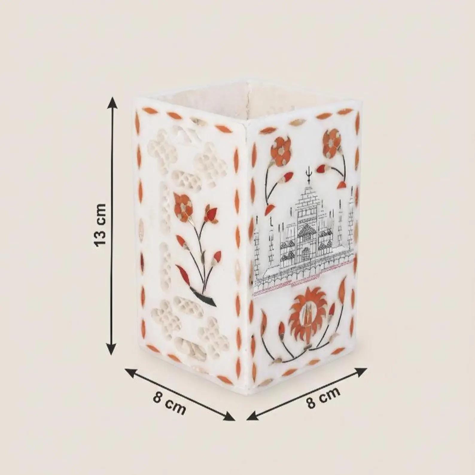 Voeg elegantie en erfgoed-geïnspireerde kunst toe aan je werkruimte met deze handgemaakte marmeren pennenhouder, prachtig versierd met gedetailleerde Taj Mahal en bloemeninleg. Dit stuk combineert functionaliteit met traditioneel vakmanschap en vormt een uniek decoratief accent voor elk bureau.