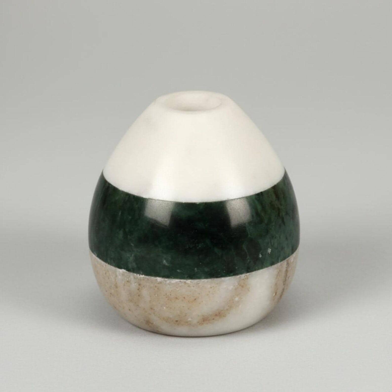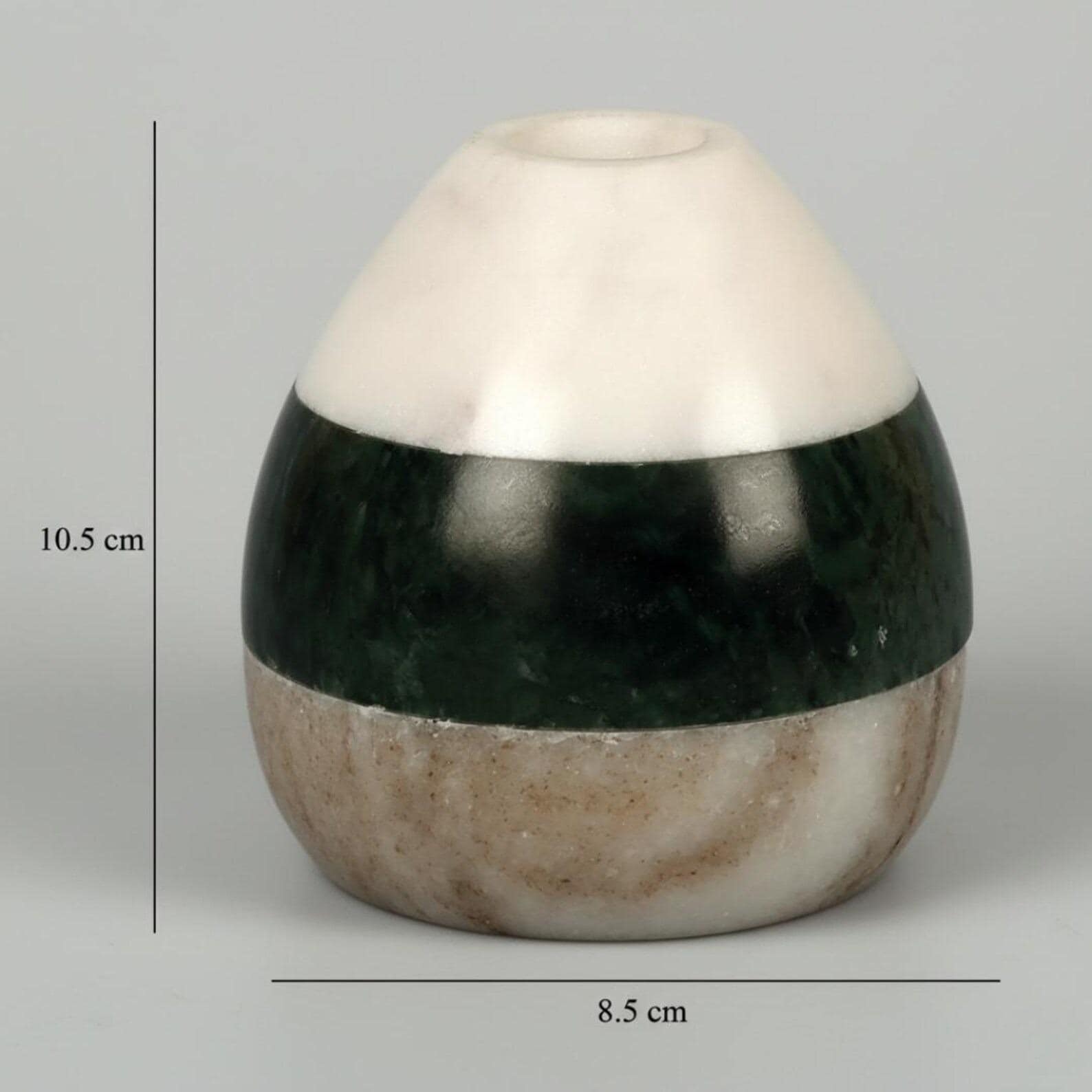 Add a soft, sculptural touch to your space with this round tri-color marble vase, handcrafted from natural stone. Featuring a harmonious blend of white, deep green, and warm brown marble, this compact vase brings a refined and earthy elegance to modern interiors.