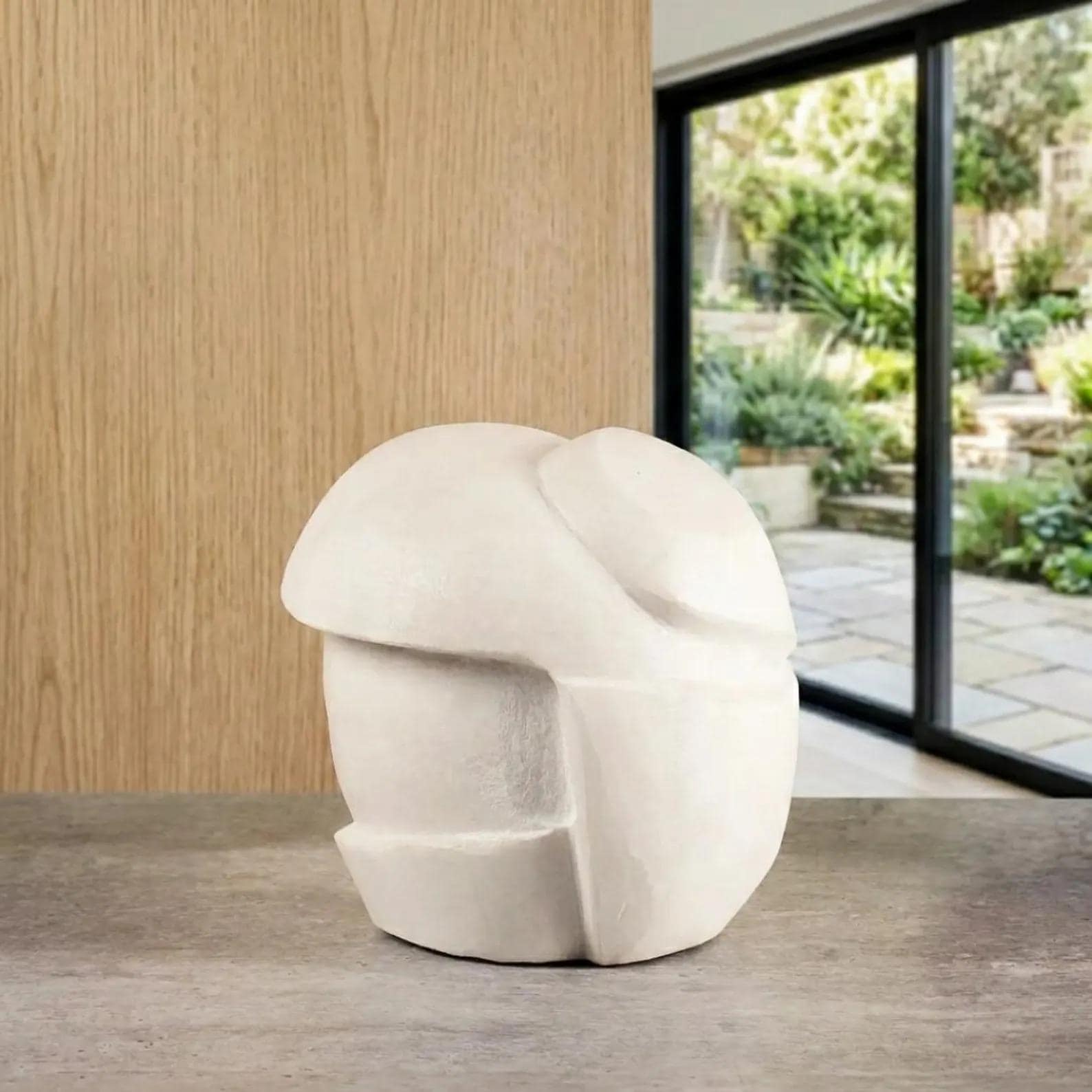 Crafted from natural stone, the sculpture features a soft, matte finish and subtle texture that enhances its sculptural presence. Its minimalist aesthetic makes it a versatile decor accent—perfect for styling shelves, consoles, or coffee tables.