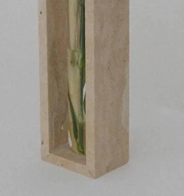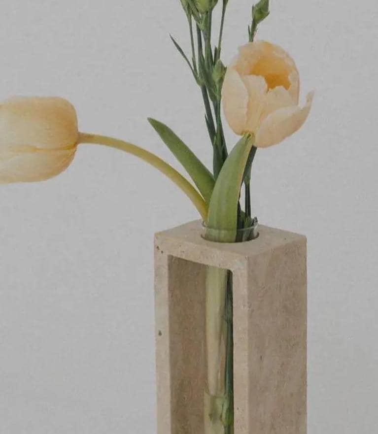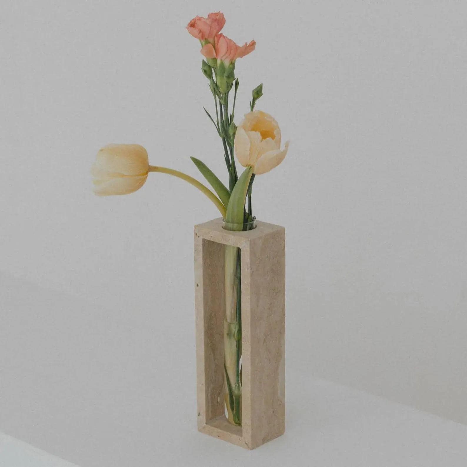 Showcase your favorite blooms with this minimalist travertine bud vase, a perfect blend of natural texture and modern design. Featuring a rectangular hollow form with a встроенной glass tube insert, this vase beautifully highlights single stems while keeping water neatly contained.