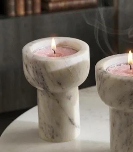 Each holder is crafted from genuine marble, showcasing unique veining patterns that make every set one of a kind. The soft pink candles paired with the cool-toned stone create a stunning contrast, ideal for cozy evenings, dinner settings, or stylish home décor displays.