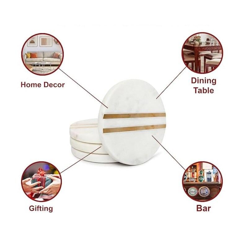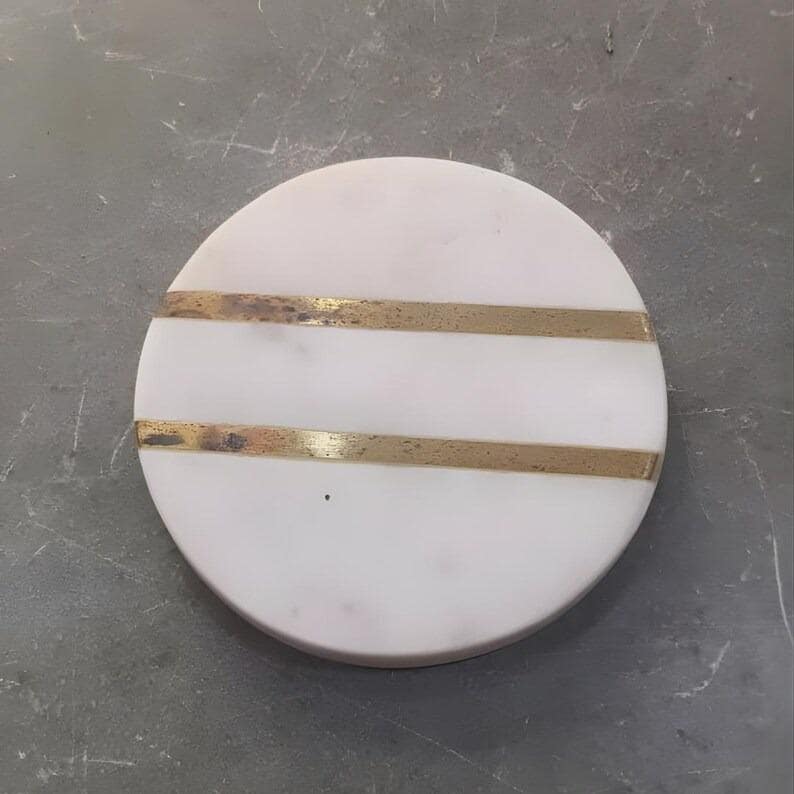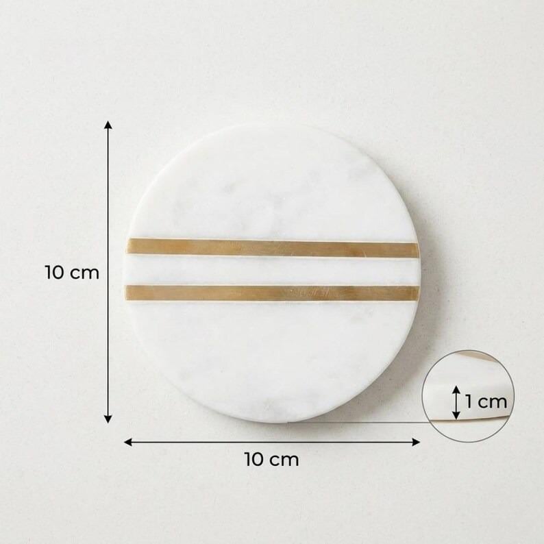 Elevate your space with these minimalist white marble coasters, featuring refined brass inlay stripes for a warm, modern accent. Crafted from natural marble, each coaster showcases subtle veining, making every piece beautifully unique.