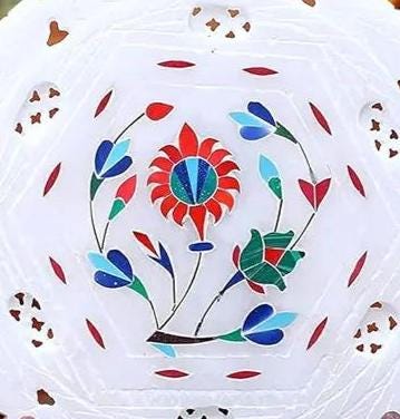 Add a touch of timeless elegance to your home with this beautifully handcrafted white marble inlay plate, featuring a vibrant floral design created using the traditional Pietra Dura technique. Each detail is carefully hand-set with semi-precious stones, resulting in a stunning piece that reflects both heritage craftsmanship and artistic beauty.