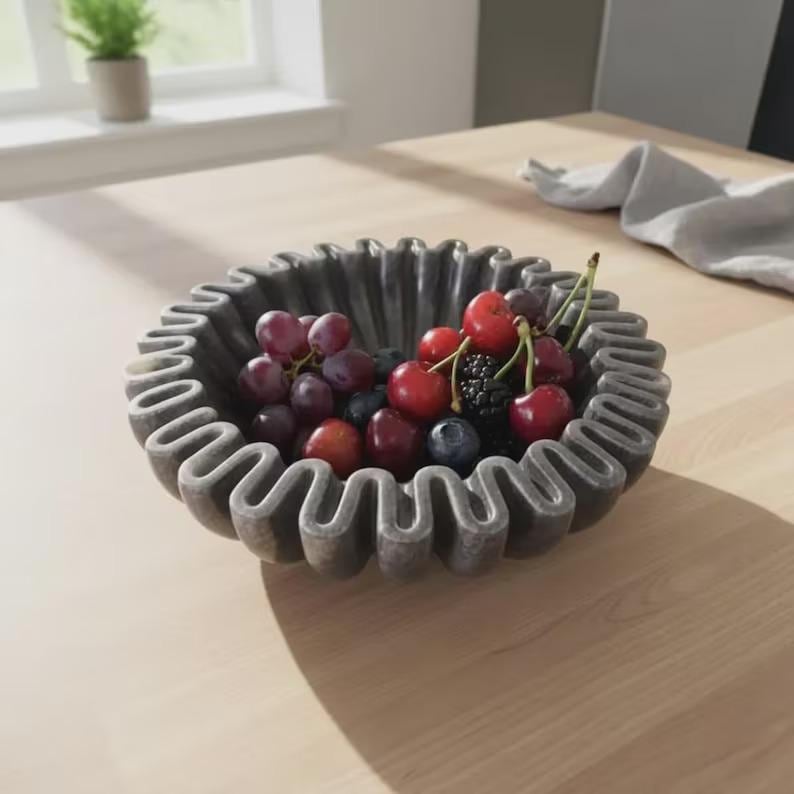 The fluid, wave-like edges create a rhythmic pattern that draws the eye inward, giving the bowl depth and dimension from every angle. Its organic yet geometric form makes it a perfect accent for contemporary, minimalist, industrial, or even wabi-sabi inspired interiors.