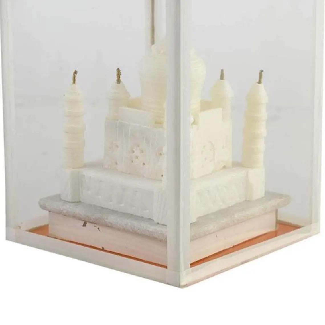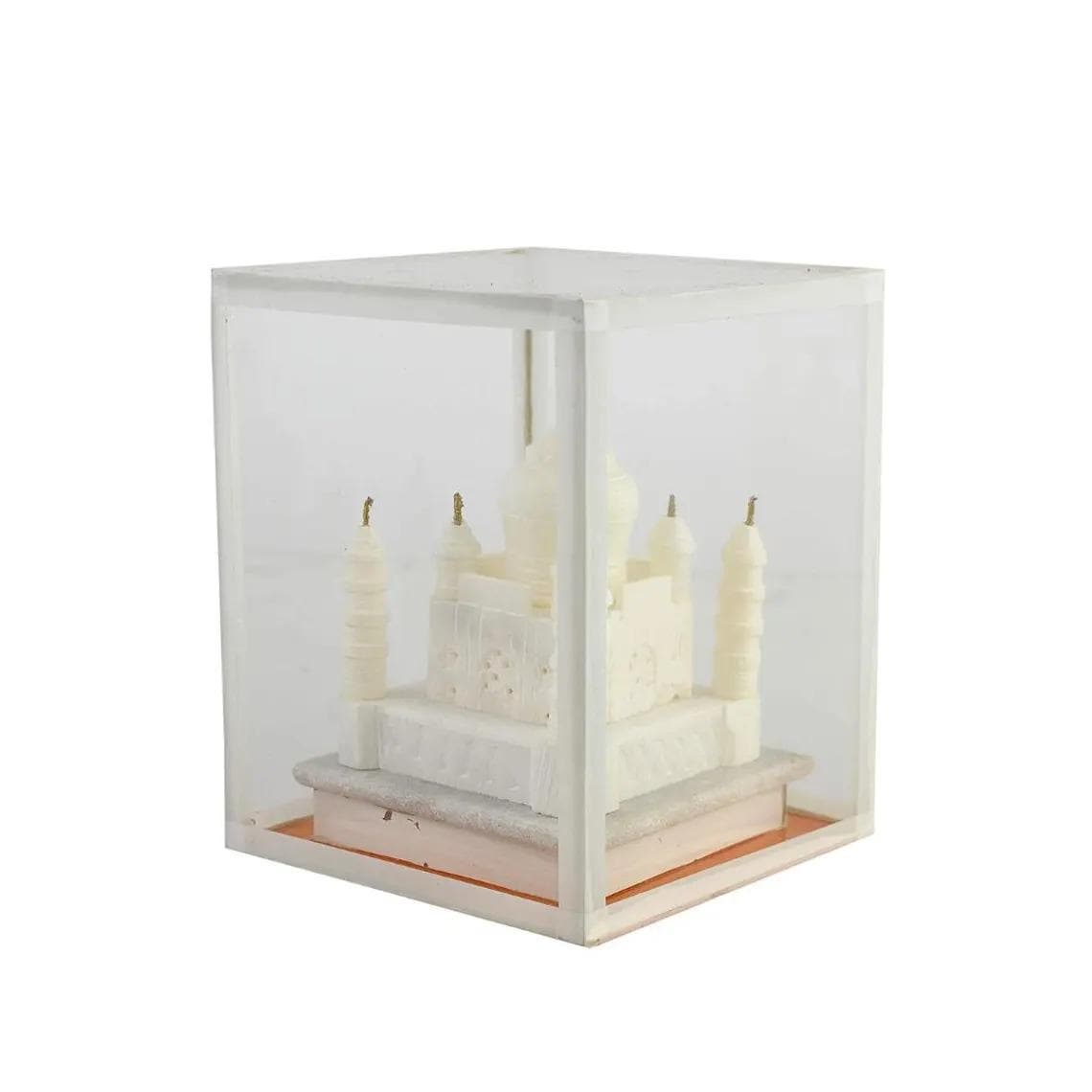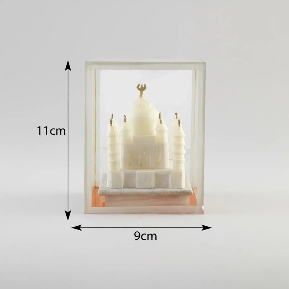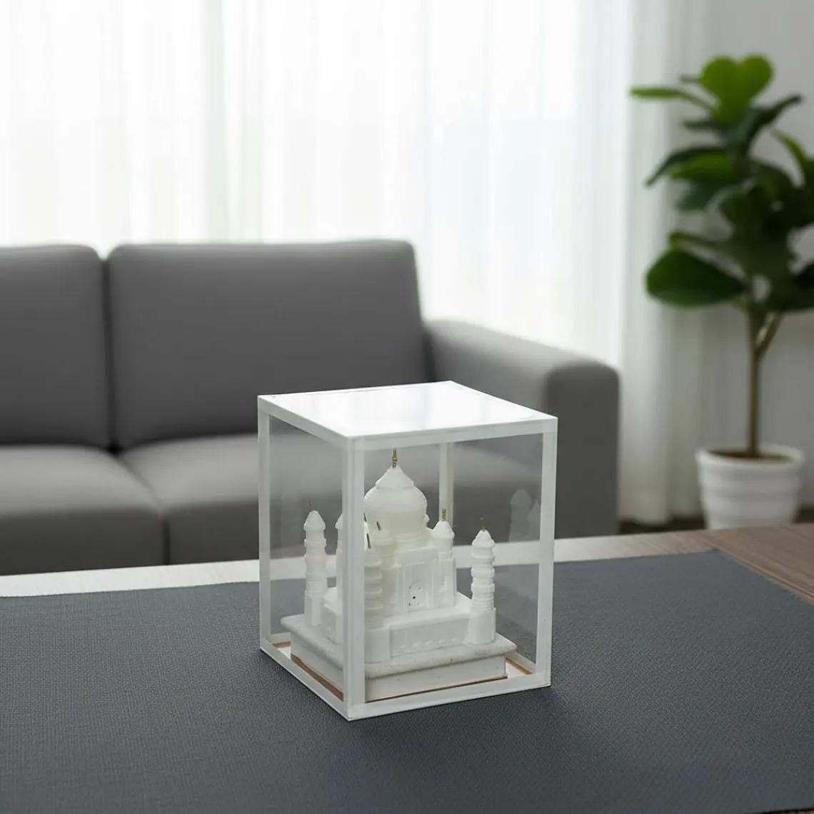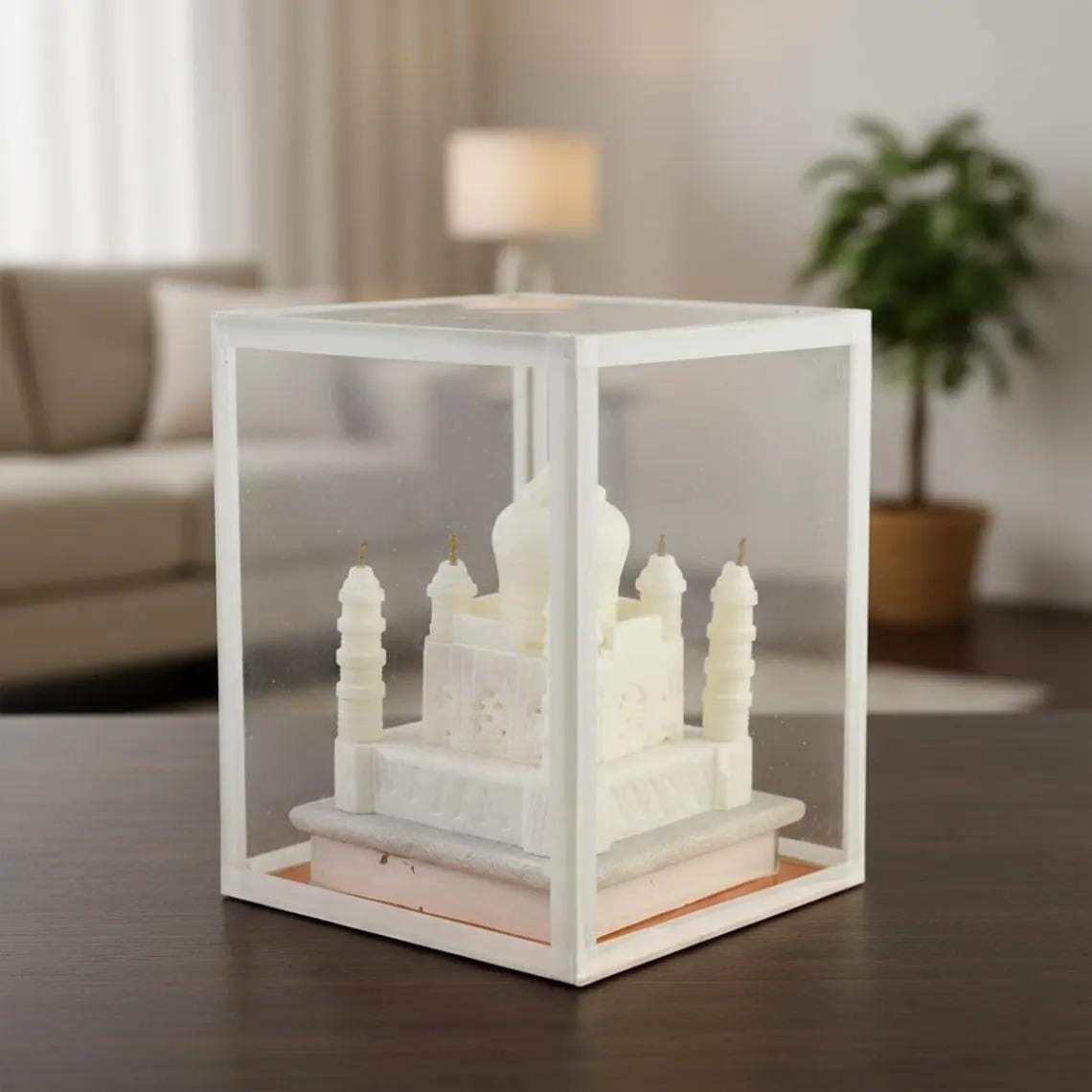 Encased within a clean-lined transparent cube, the finely detailed Taj Mahal replica appears preserved like a museum artifact—protected, elevated, and beautifully displayed from every angle.