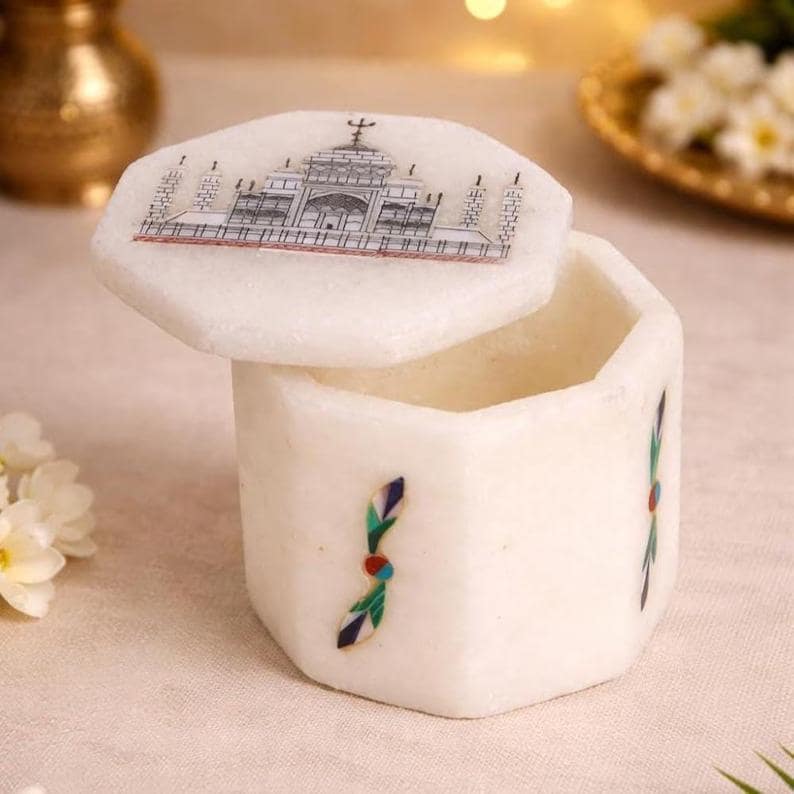 Taj Mahal Engraved Lid: The top features a finely detailed illustration of the iconic monument, adding cultural and artistic charm