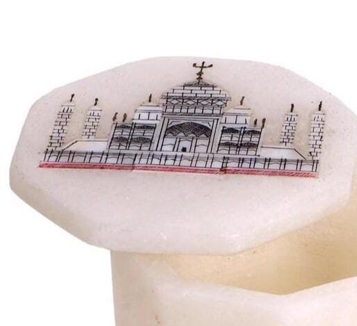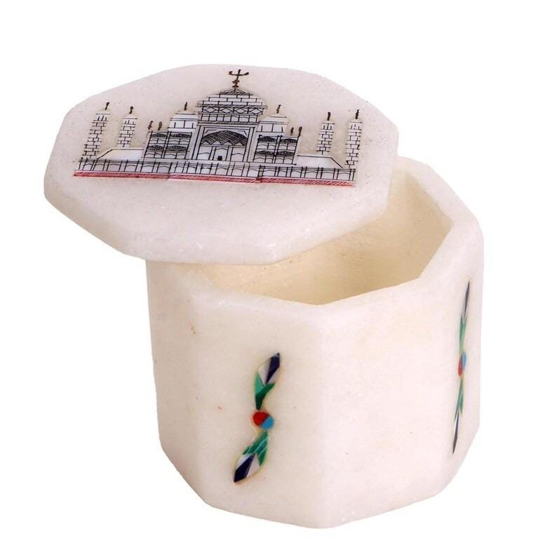 Store your precious items in timeless elegance with this handcrafted marble jewelry box, featuring a beautifully detailed lid inspired by the iconic Taj Mahal. Combining functional storage with artistic craftsmanship, this piece is a perfect blend of heritage design and everyday utility.